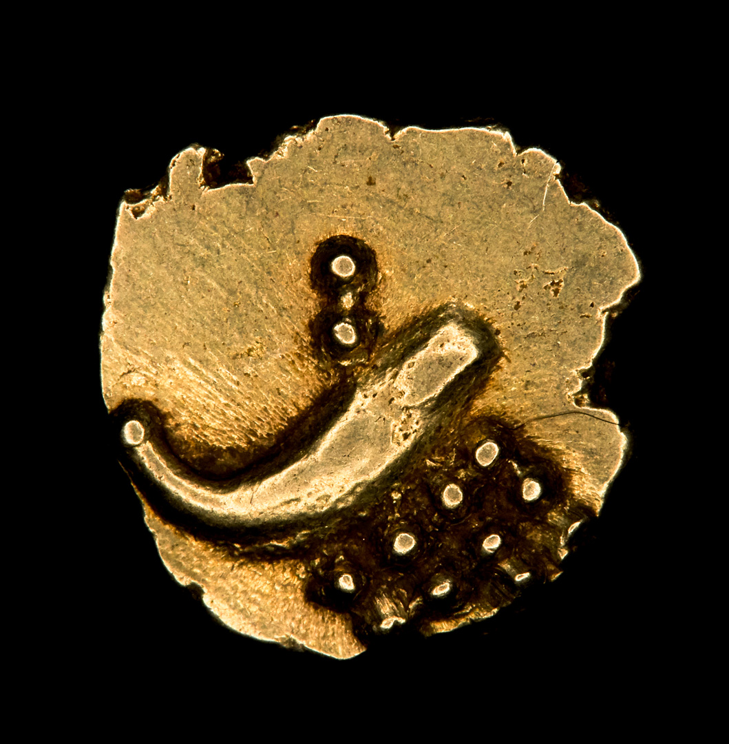 Measuring approximately 5 to 6.5 mm and weighing about .3 to .4 grams, India Gold Fanams are the worlds smallest circulating gold coins. Gold Fanams were minted in high grade gold by several southern Indian states. With most being struck between 1700 and 1830, these coins use a stylized line and dot design to form abstract deities, animals or other art.