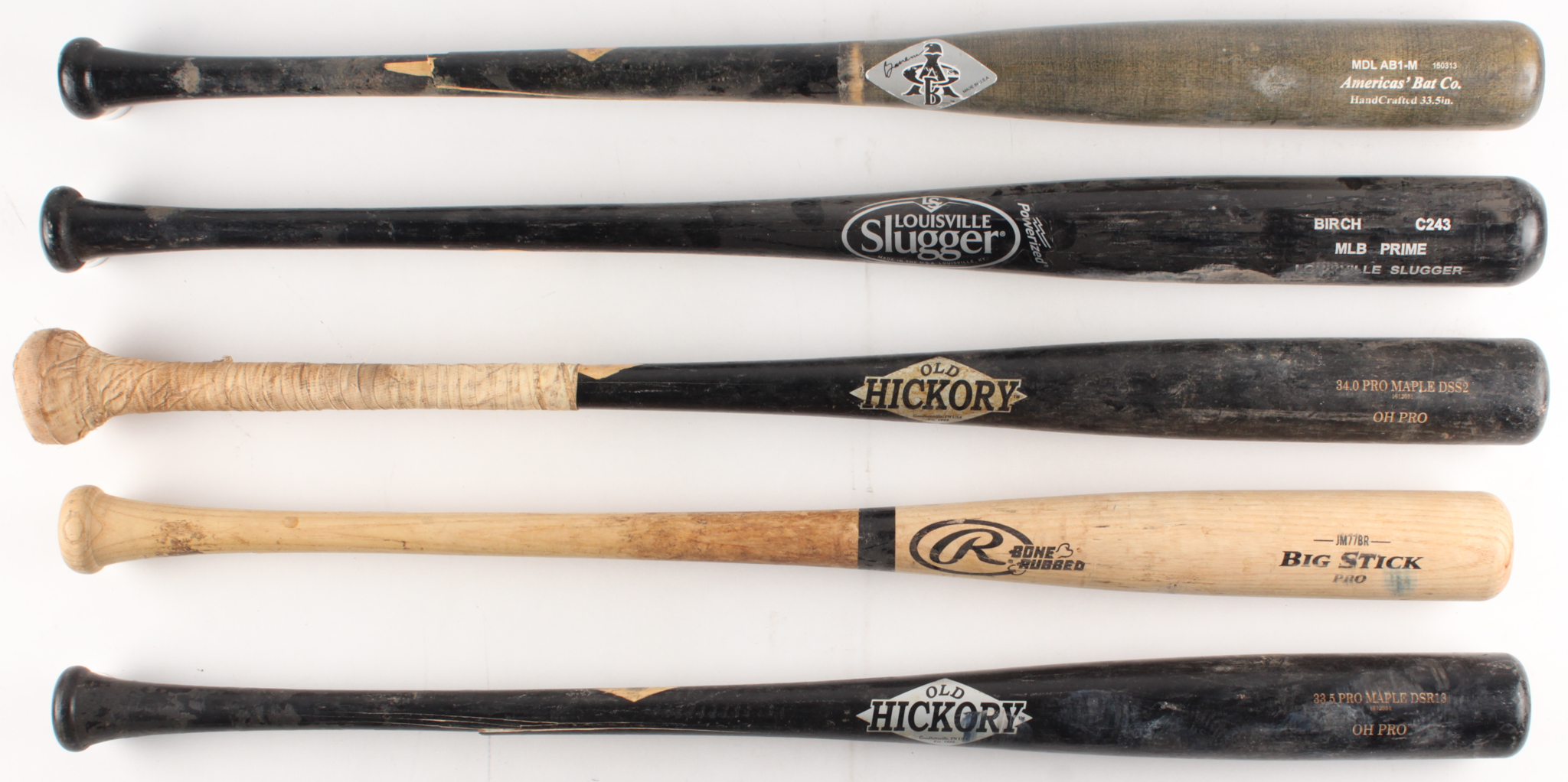 Lot includes all (6) assorted game-used baseball bats shown. Lot includes (1) Louisville Slugger baseball bats, (2) Old Hickory baseball bats, (1) Rawlings baseball bat, and (1) America's Bat Co. baseball bat. Please note, the bats have each been game-used and cracked by unknown players.