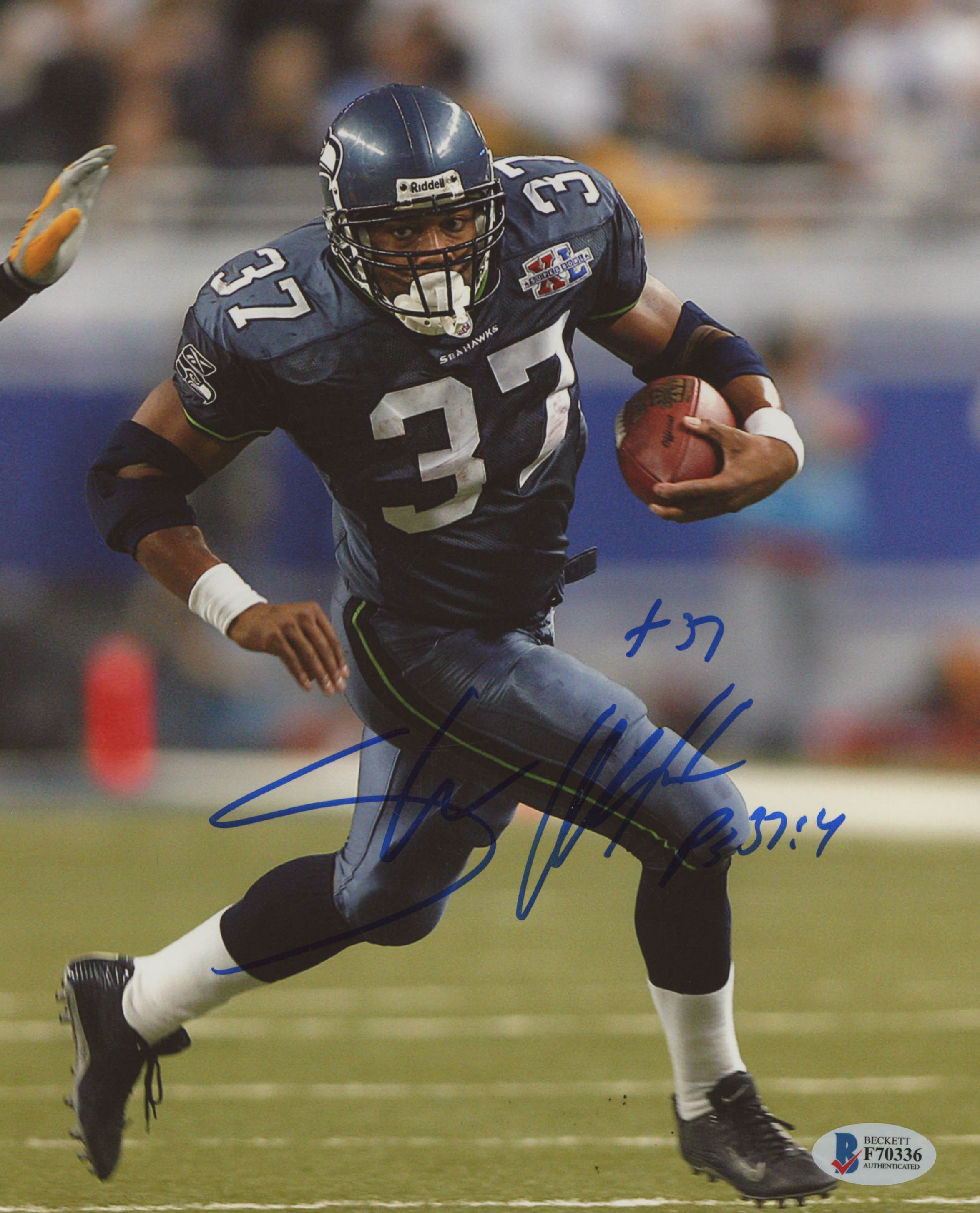 Photo measures 8" x 10" in size and has been hand-signed in blue felt-tip pen by Shaun Alexander.