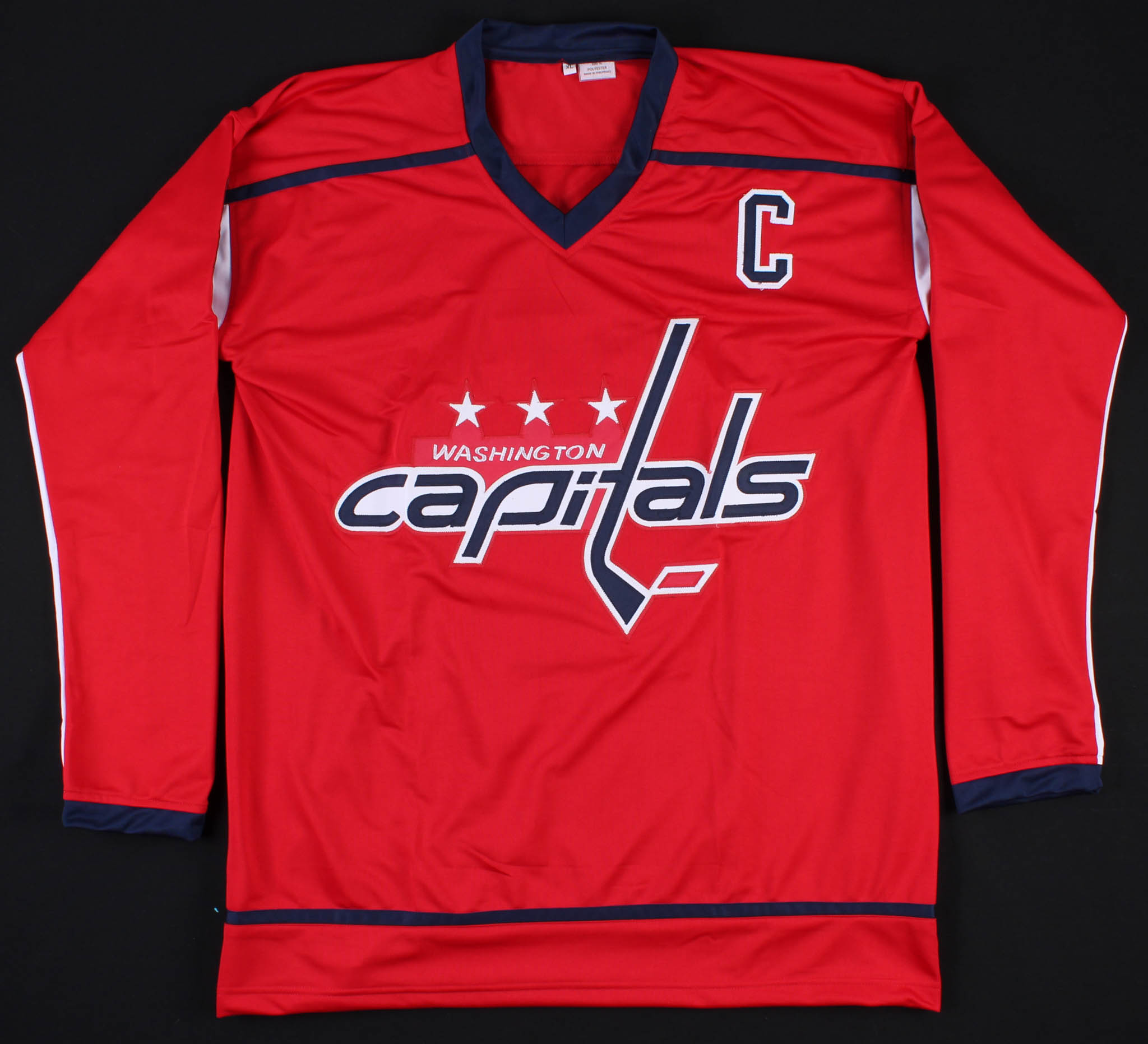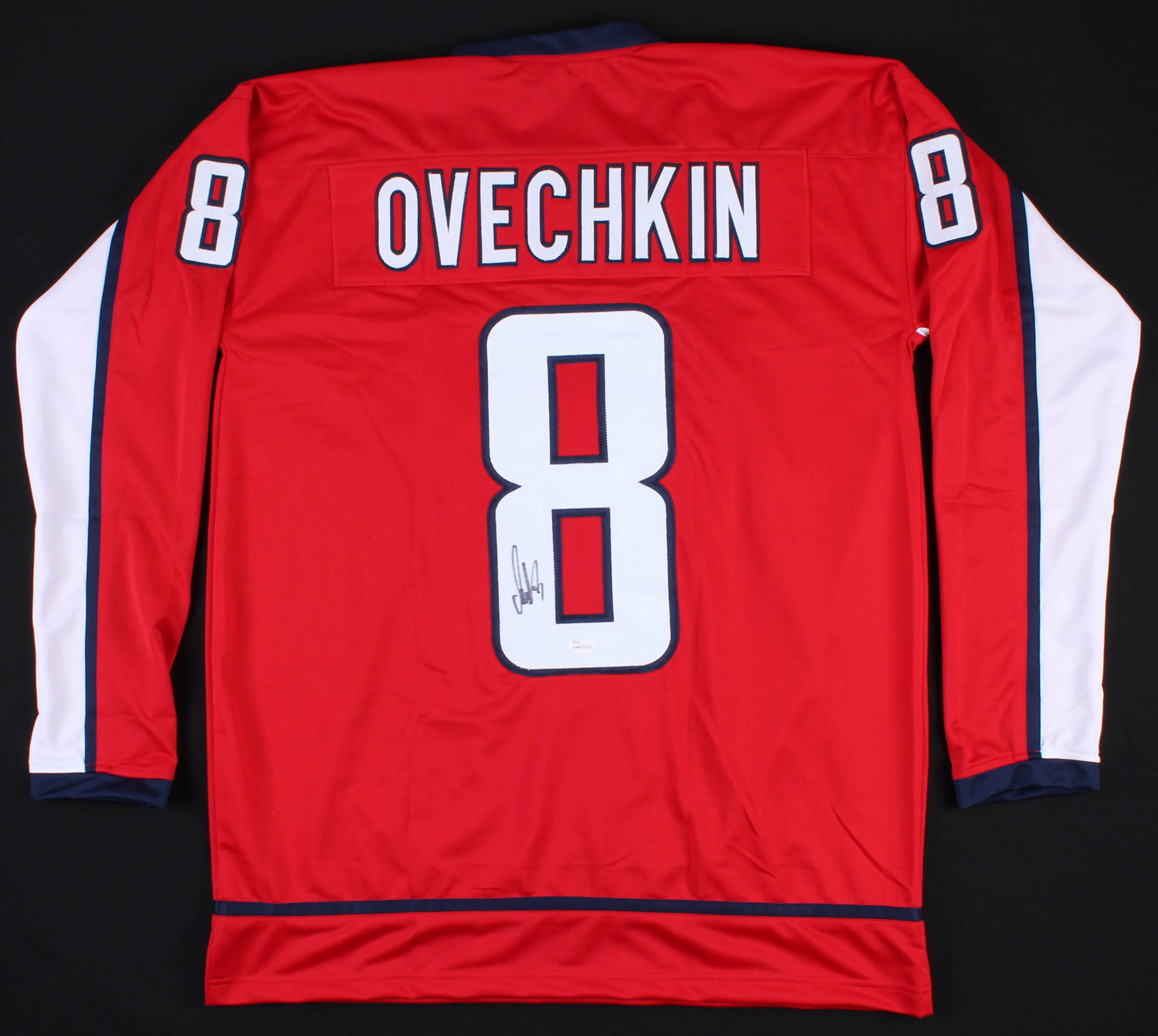 Custom on-ice style jersey. Everything sewn on, size XL. Hand-signed in black felt-tip pen by Alexander Ovechkin.