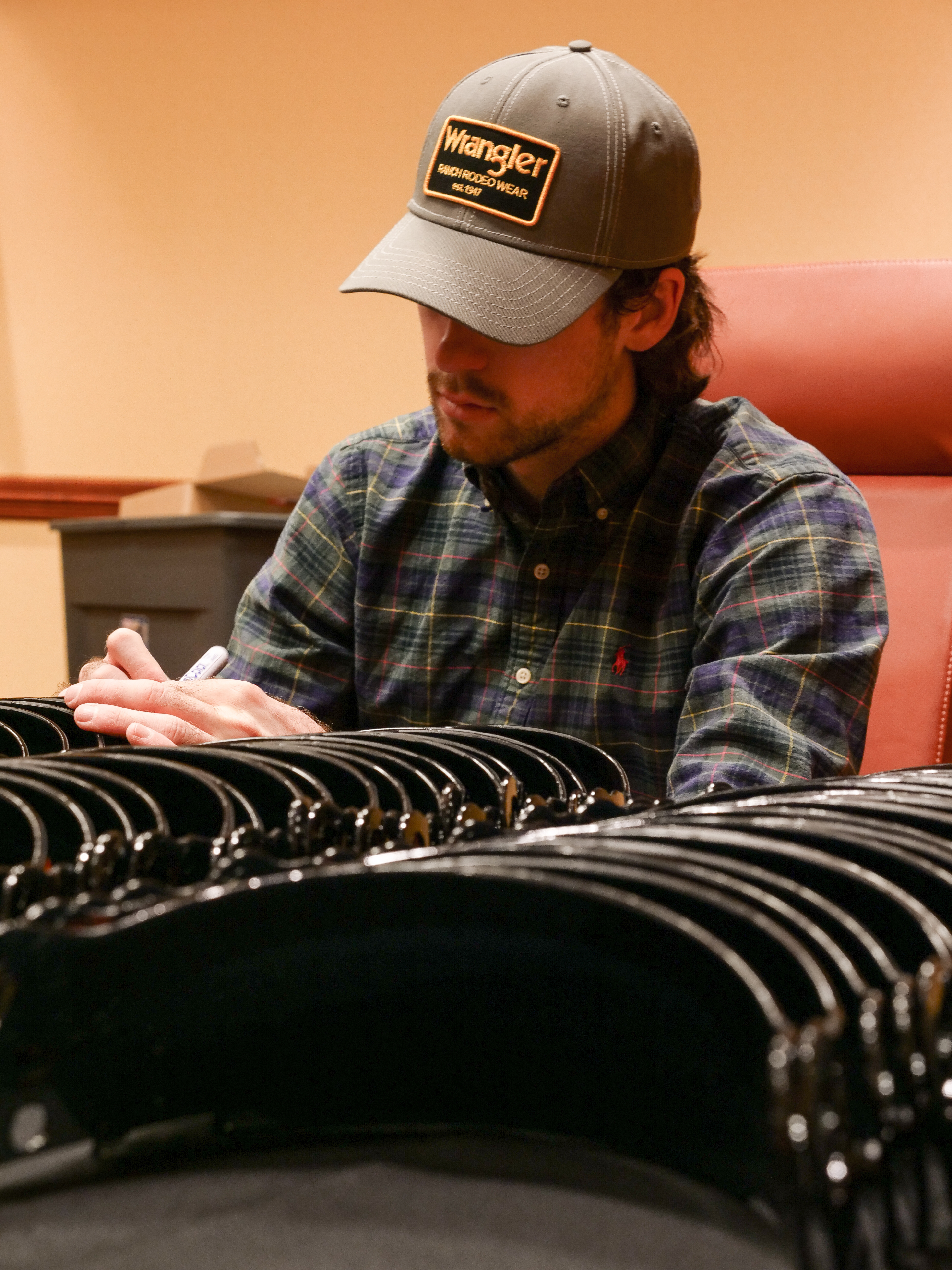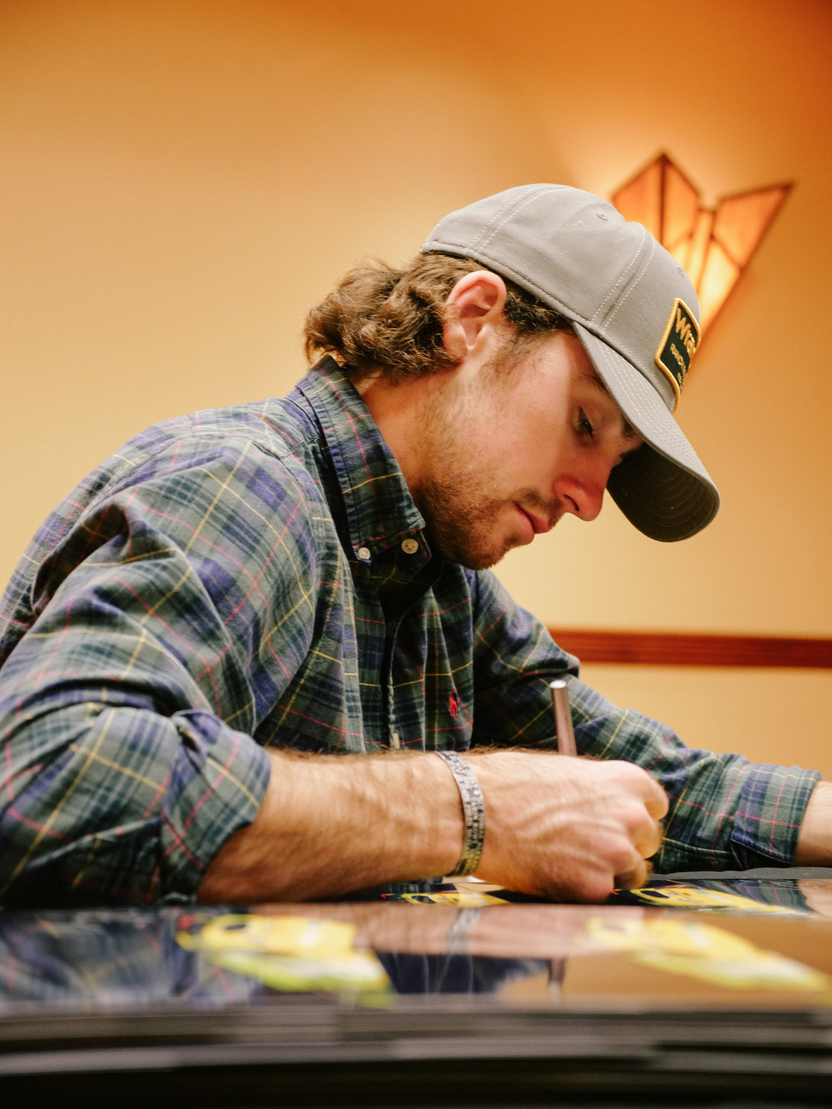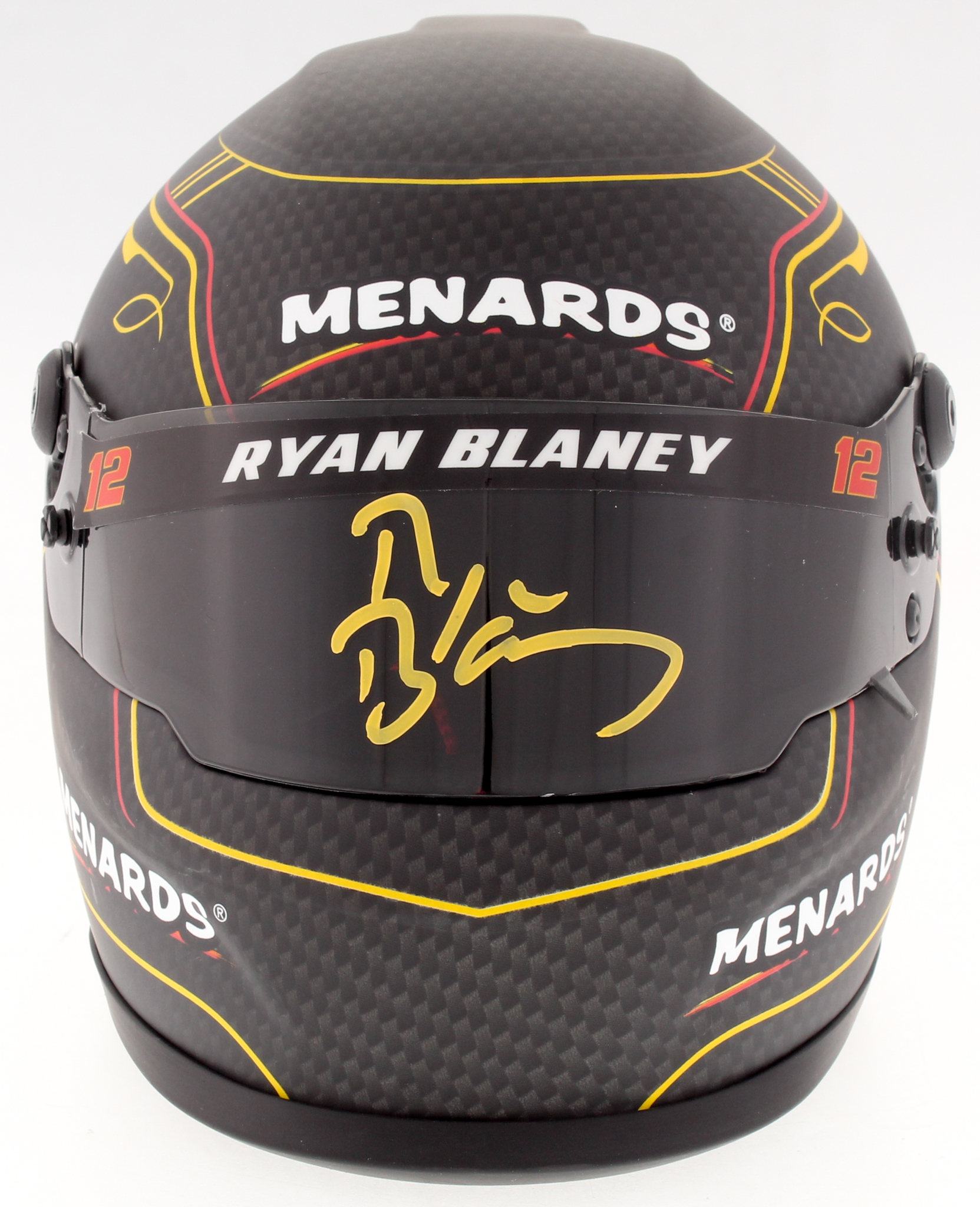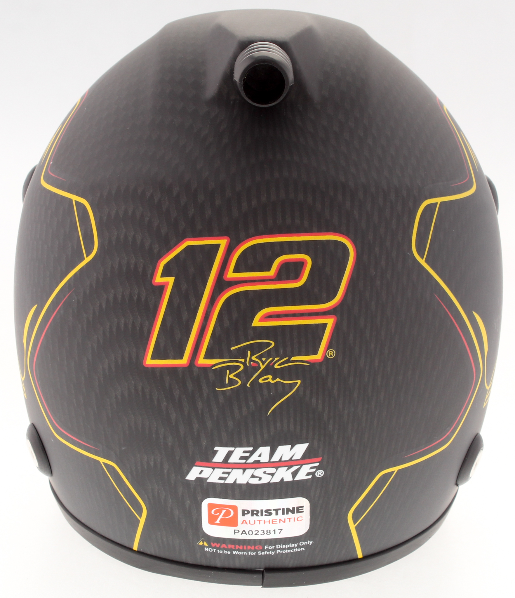 Special edition replica NASCAR mini-helmet hand-signed on the visor in yellow paint pen by Ryan Blaney.