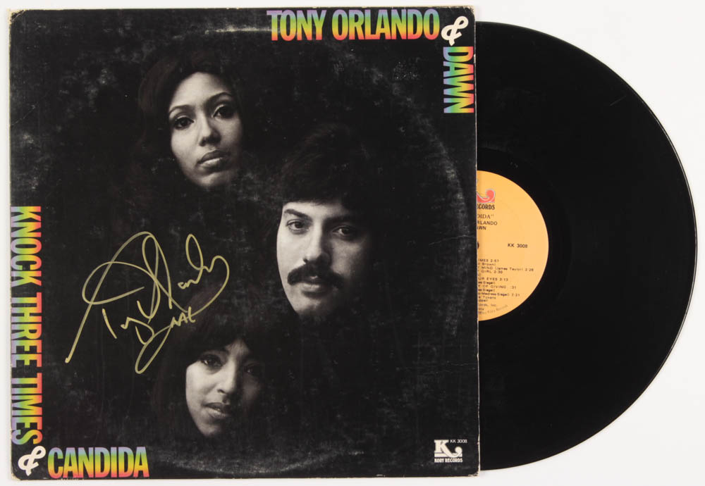 Tony Orlando "Knock Three Times & Candida" vinyl record album has been hand-signed in gold paint pen by Tony Orlando. Please note that the vinyl record is included with this auction.