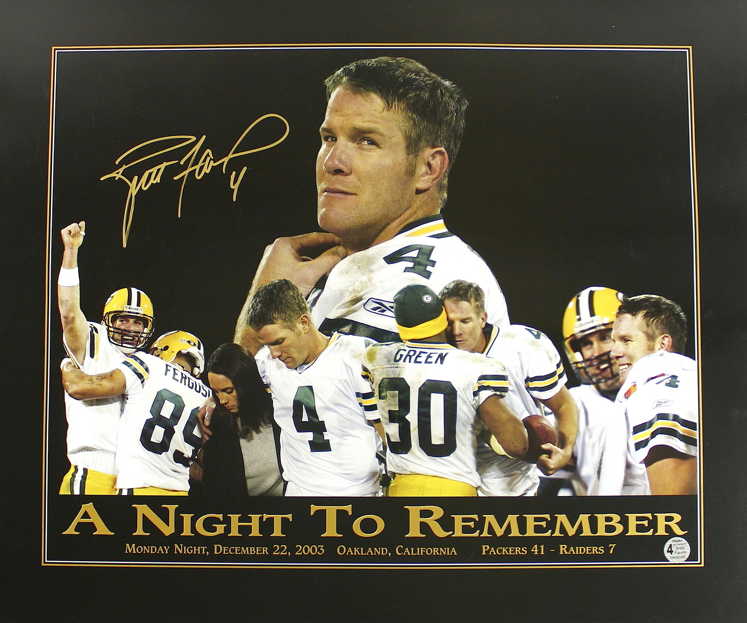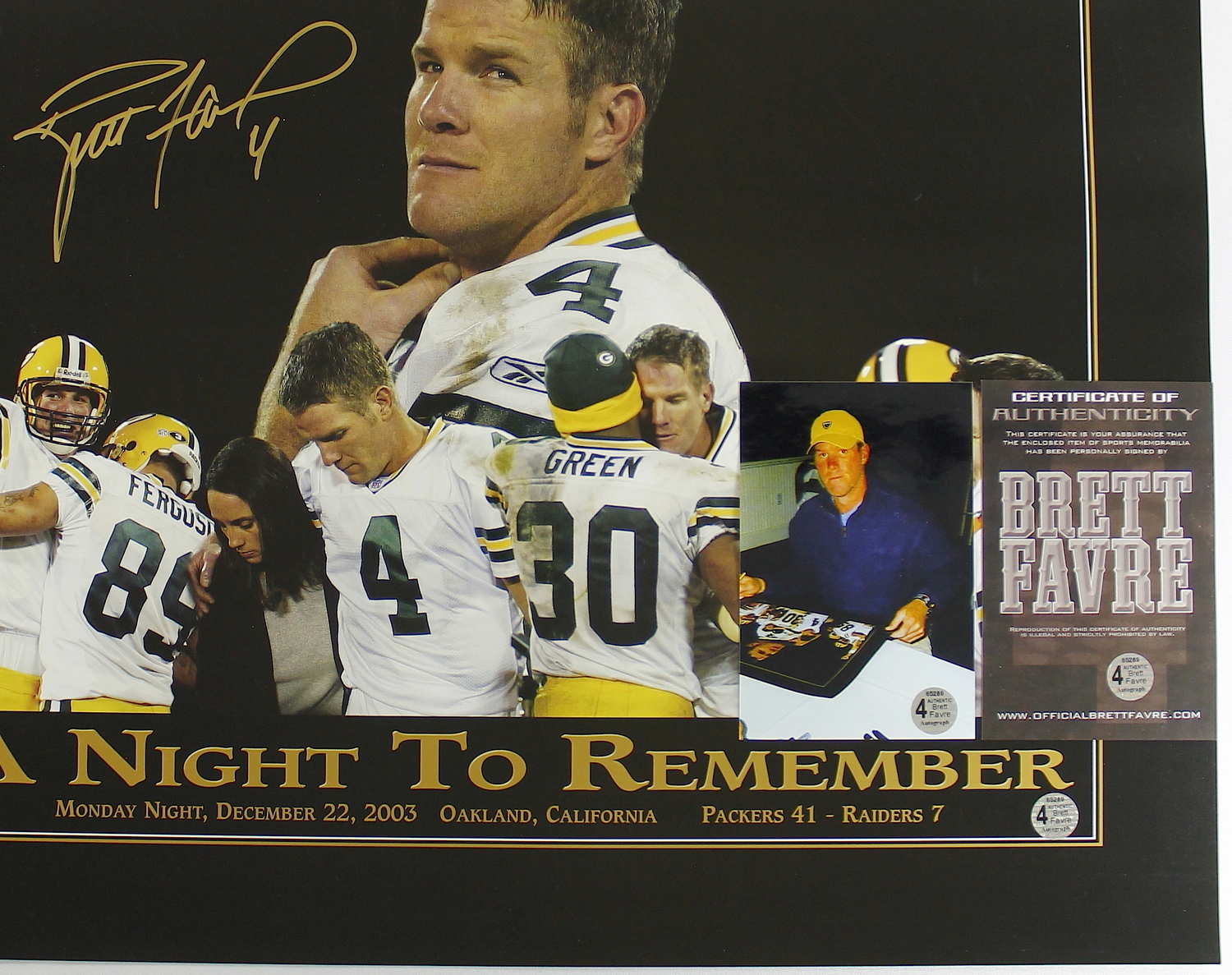 20" x 24" Photo hand-signed in gold paint pen by Brett Favre (Packers) "A Night To Remember" Lithograph. Lithograph commemorates Favre's Monday Night Performance on Dec 22, 2003. The autograph includes an official Brett Favre hologram and matching COA for authenticity purposes.