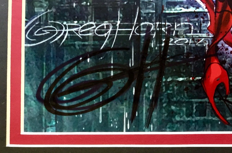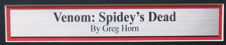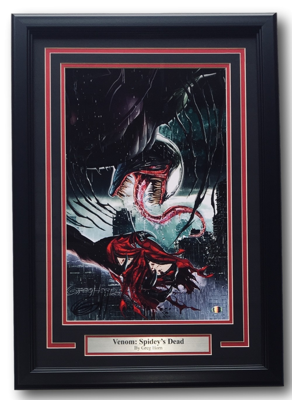 Custom frame measures 17" x 25" in size and features a print of Greg Horn's "Venom: Spidey's Dead" hand-signed in black felt-tip pen by Greg Horn.