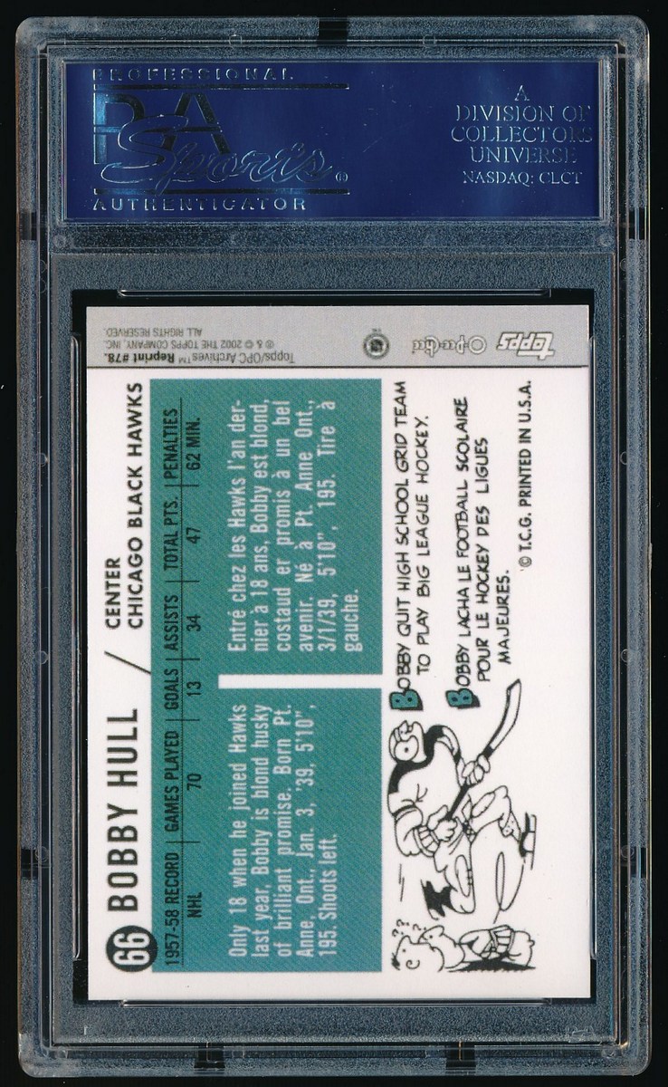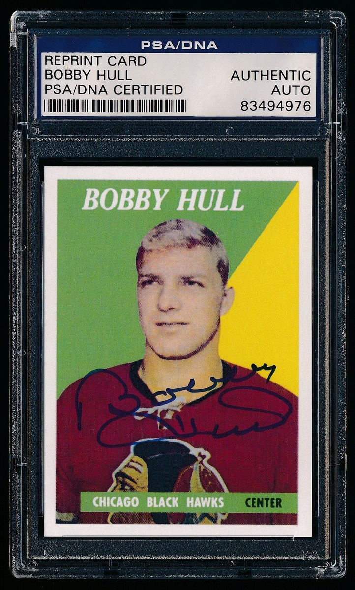 Hockey Reprint Card. Hand-signed in blue felt-tip pen by Bobby Hull (Blackhawks HOF). Autograph has been encapsulated by PSA/DNA for authenticity purposes.