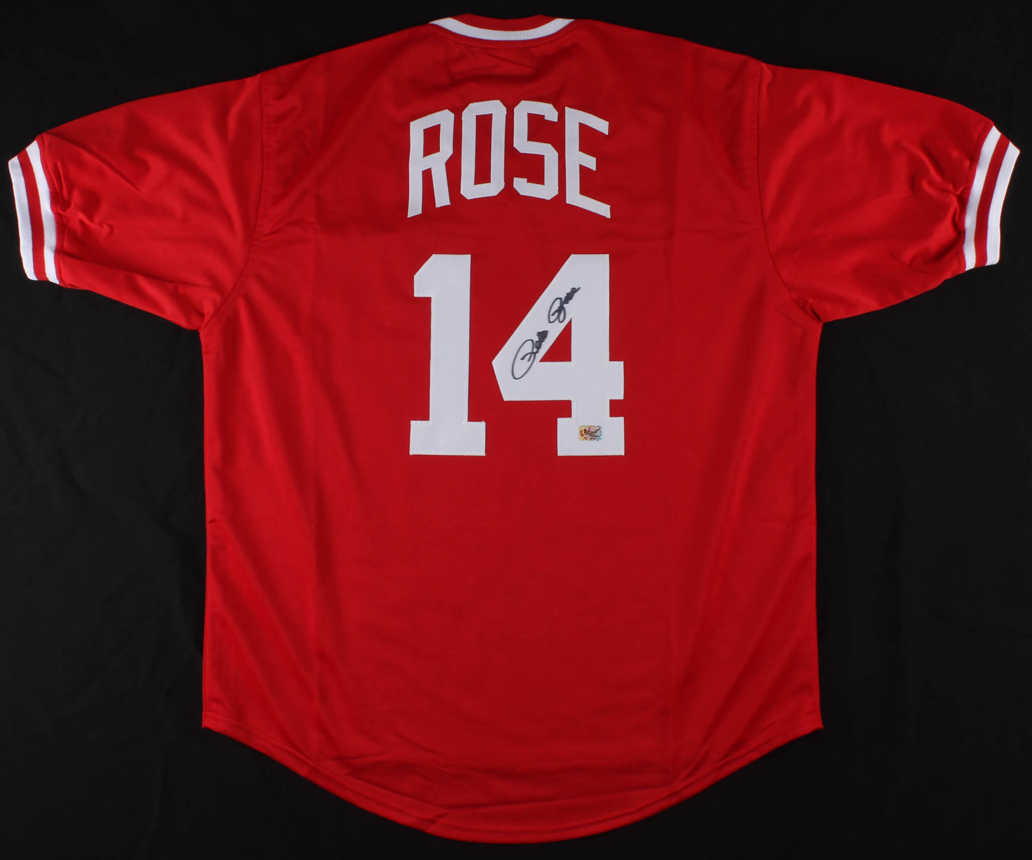 Custom on-field style jersey. Everything is sewn on, size XL. Hand-signed in black felt-tip pen by Pete Rose.