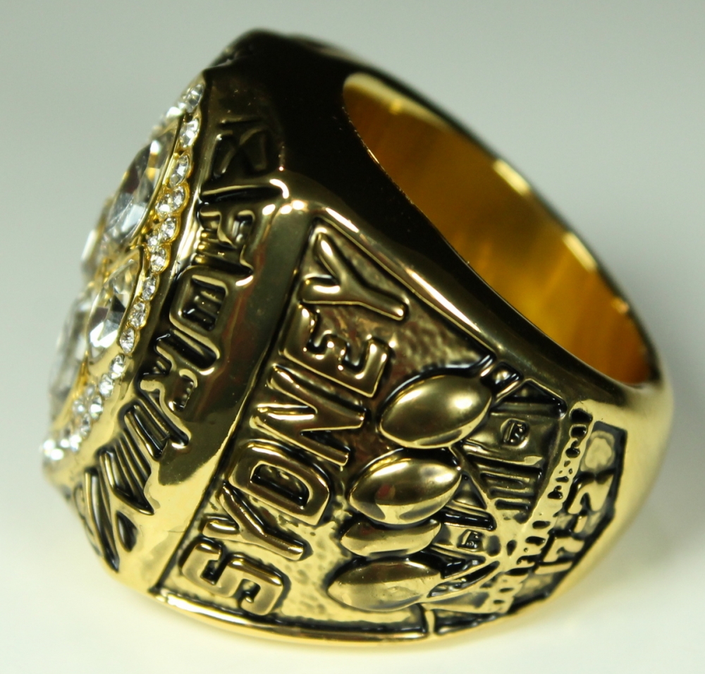 Harry Sydney San Francisco 49ers High Quality Replica 1989 Super Bowl XXIV champions ring. The ring has been hand crafted by professional jewelers. Made of metal alloy and clad with 18K gold. Size 10.