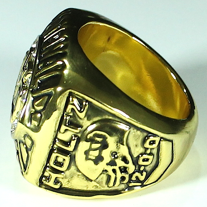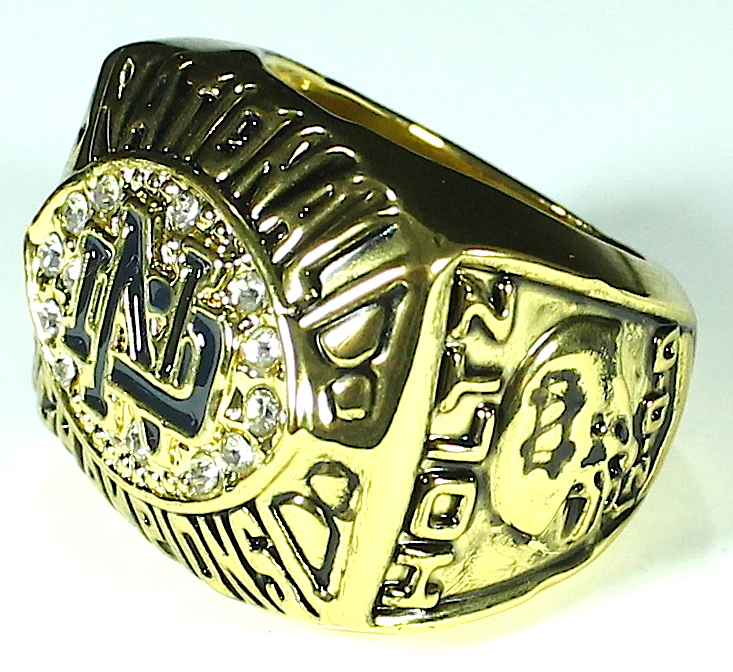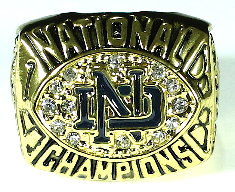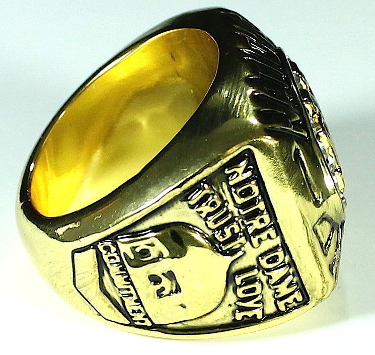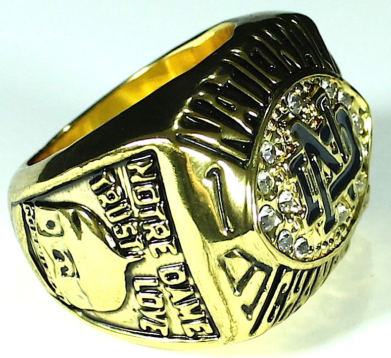 Lou Holtz Notre Dame High Quality Replica 1988 Football National Champions Ring. The ring has been hand crafted by professional jewelers. Made of metal alloy and clad with 18K Gold. Size 11.5.