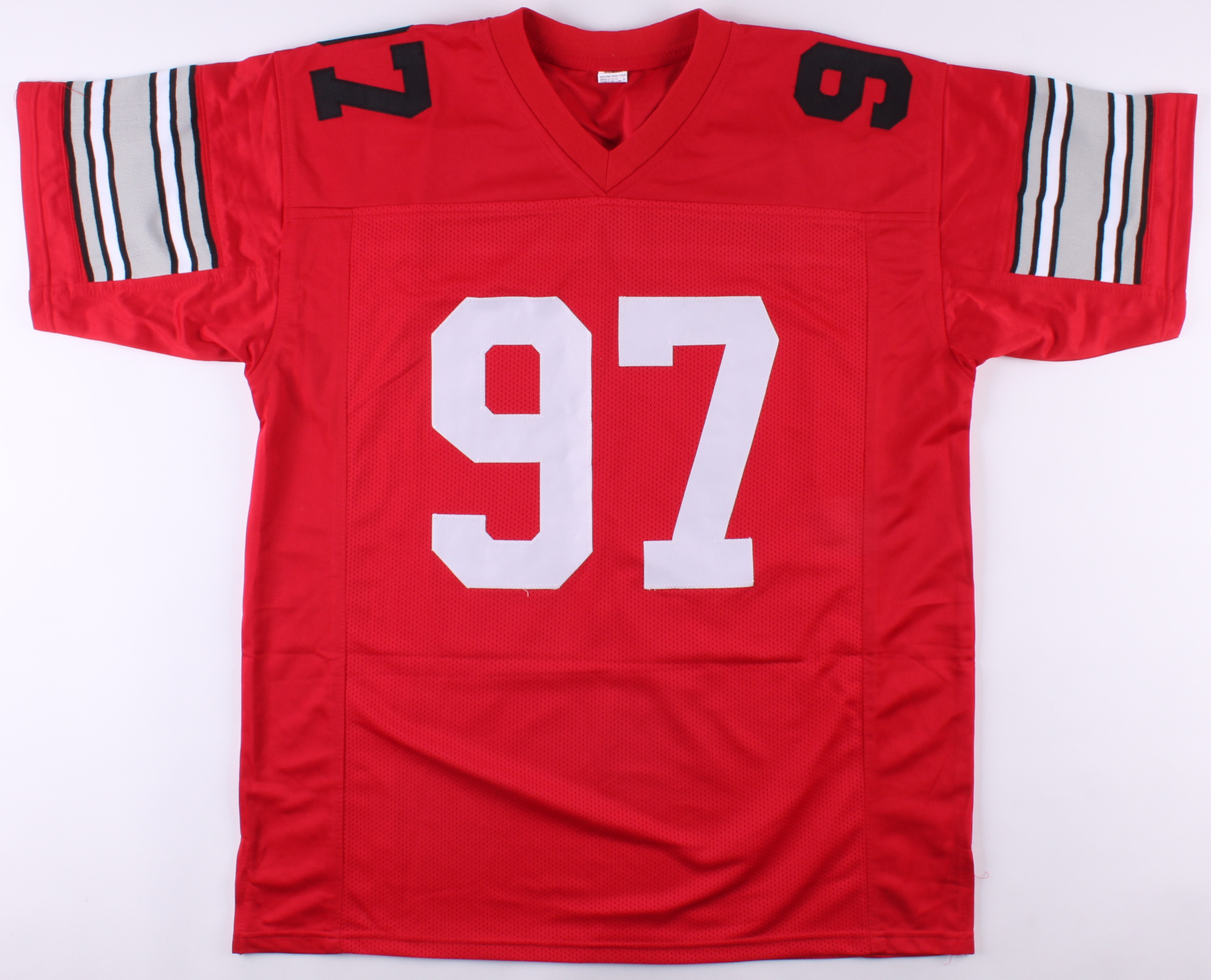 Custom on-field style jersey. Everything is sewn on, size XL. Hand-signed in black felt-tip pen by Joey Bosa.