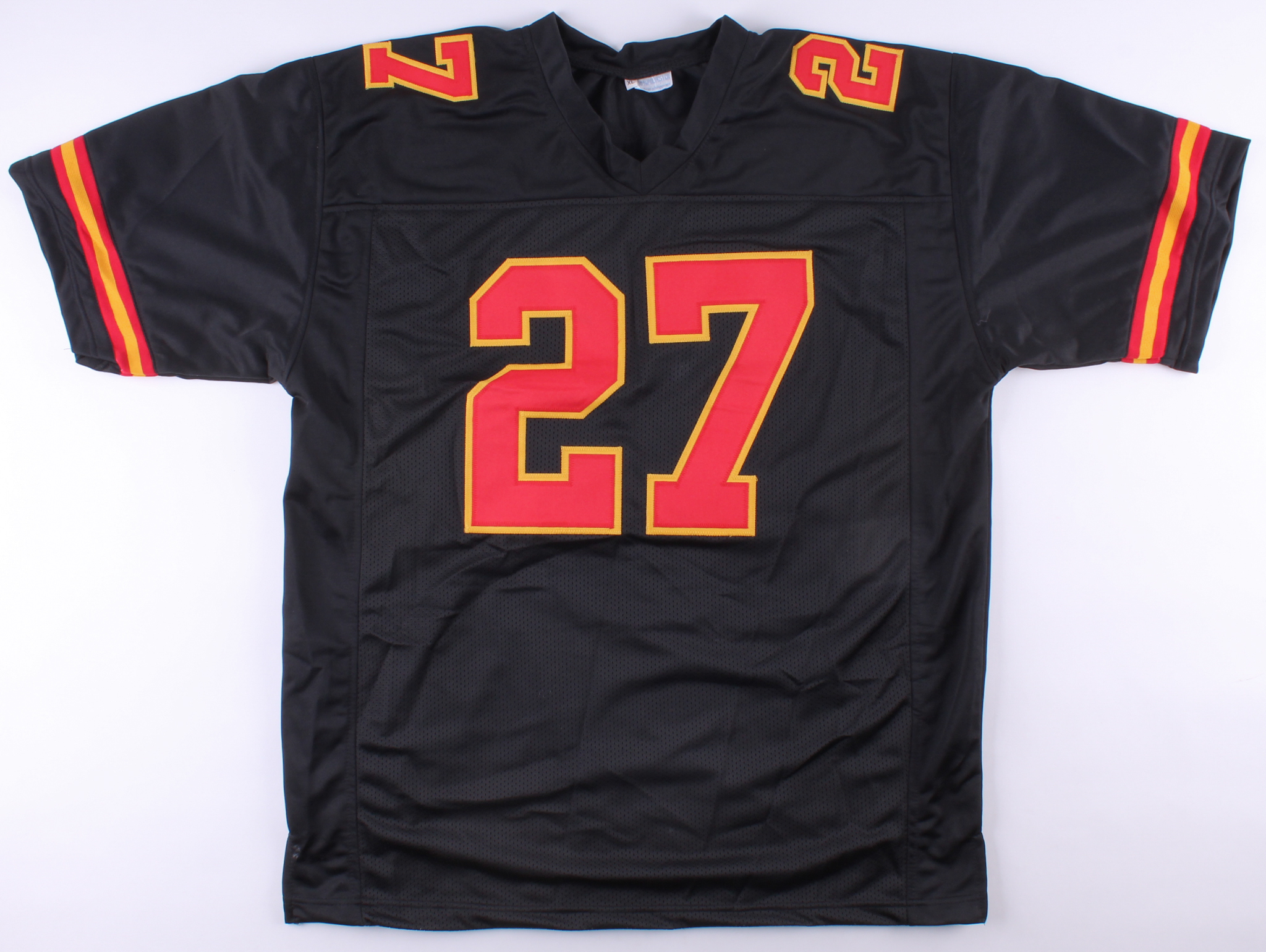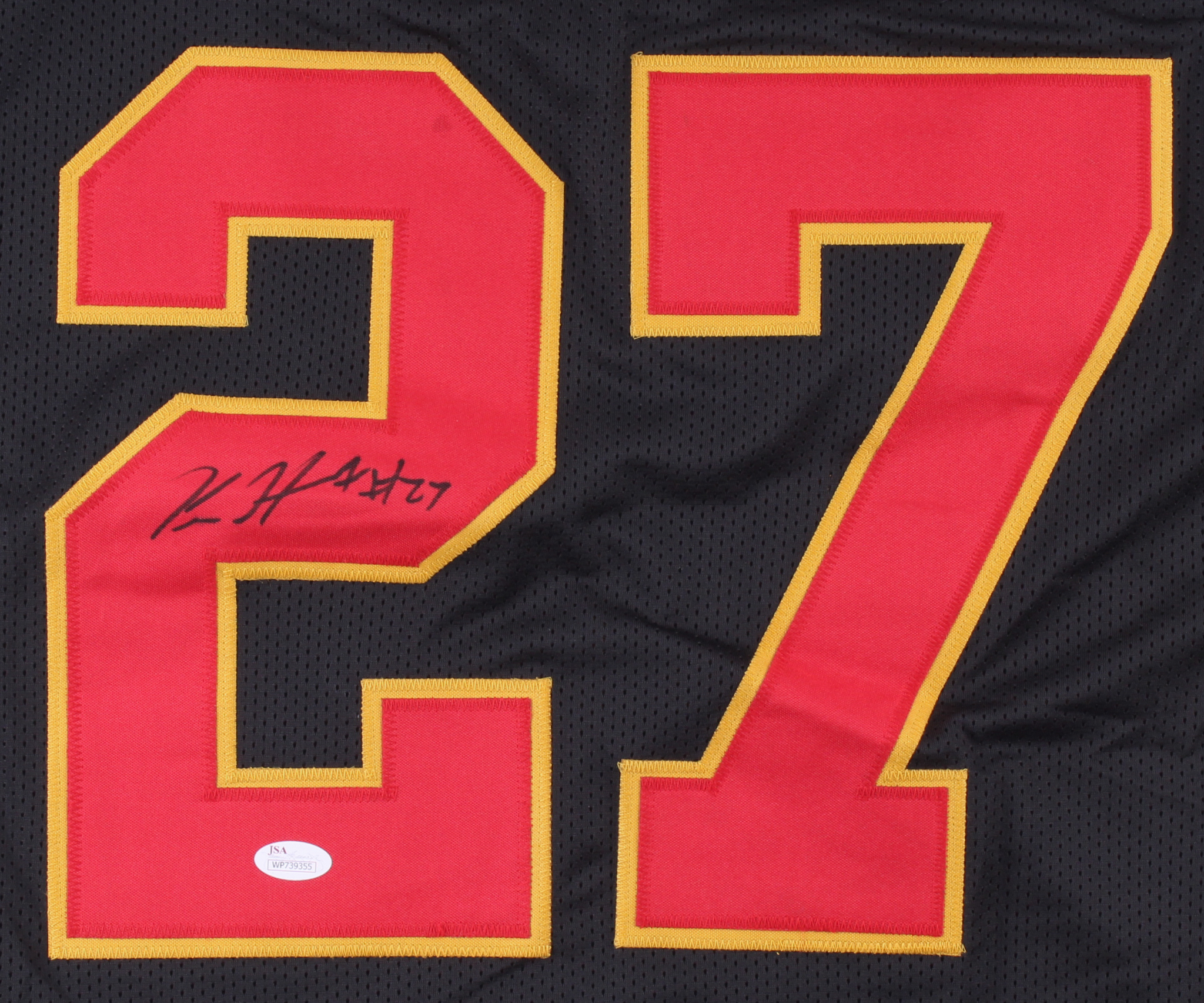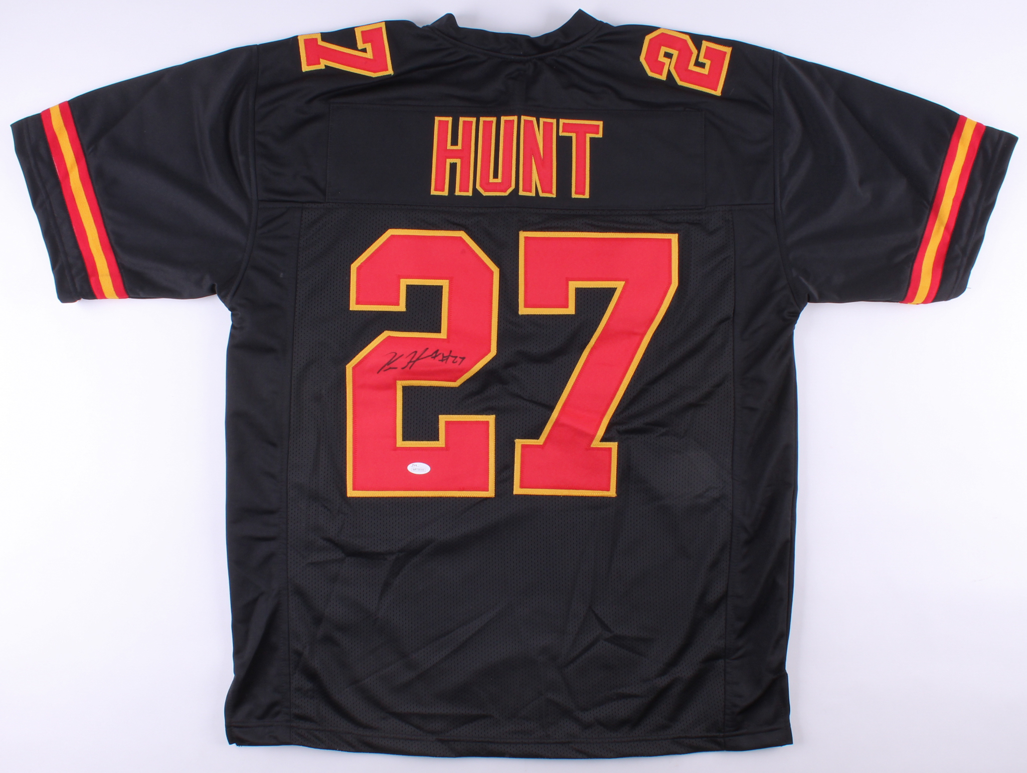 Custom on-field style jersey. Everything is sewn on, size XL. Hand-signed in back felt-tip pen by Kareem Hunt. Please note, jersey shows signs of minor wear.
