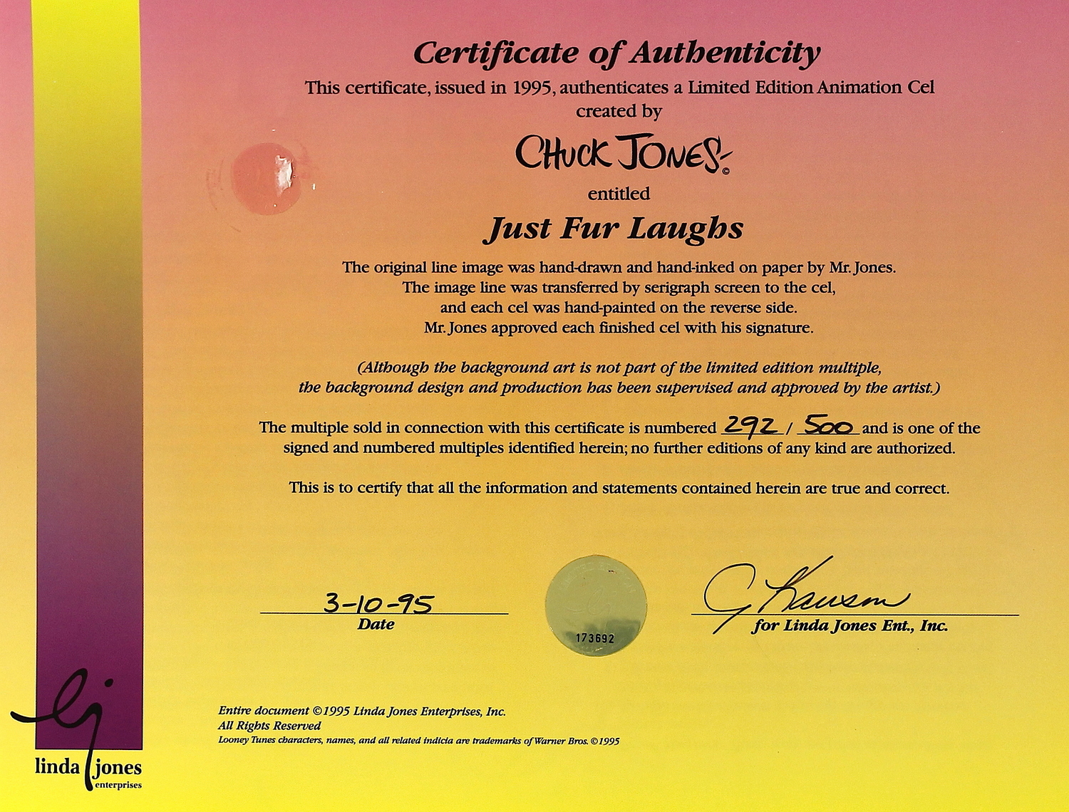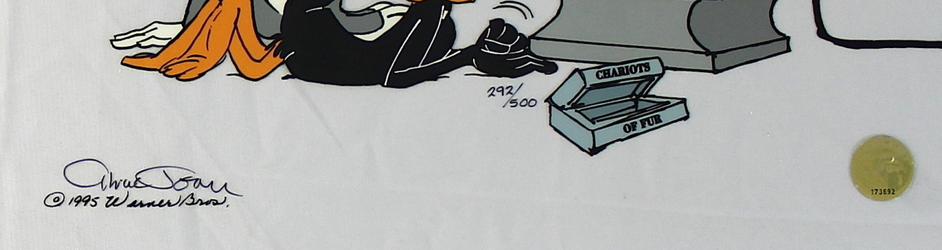 Hand-painted animation cel measures approximately 16.5" x 13.5" in size and is part of a sold out edition. Retail Price $1,350. The piece is hand-signed in the lower right corner by legendary animator Chuck Jones (D 2002). Hand-numbered #292/500.