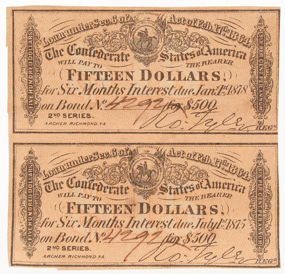 1864 $15 Fifteen Dollar Uncut Confederate States of America Richmond CSA Bank Note Bond