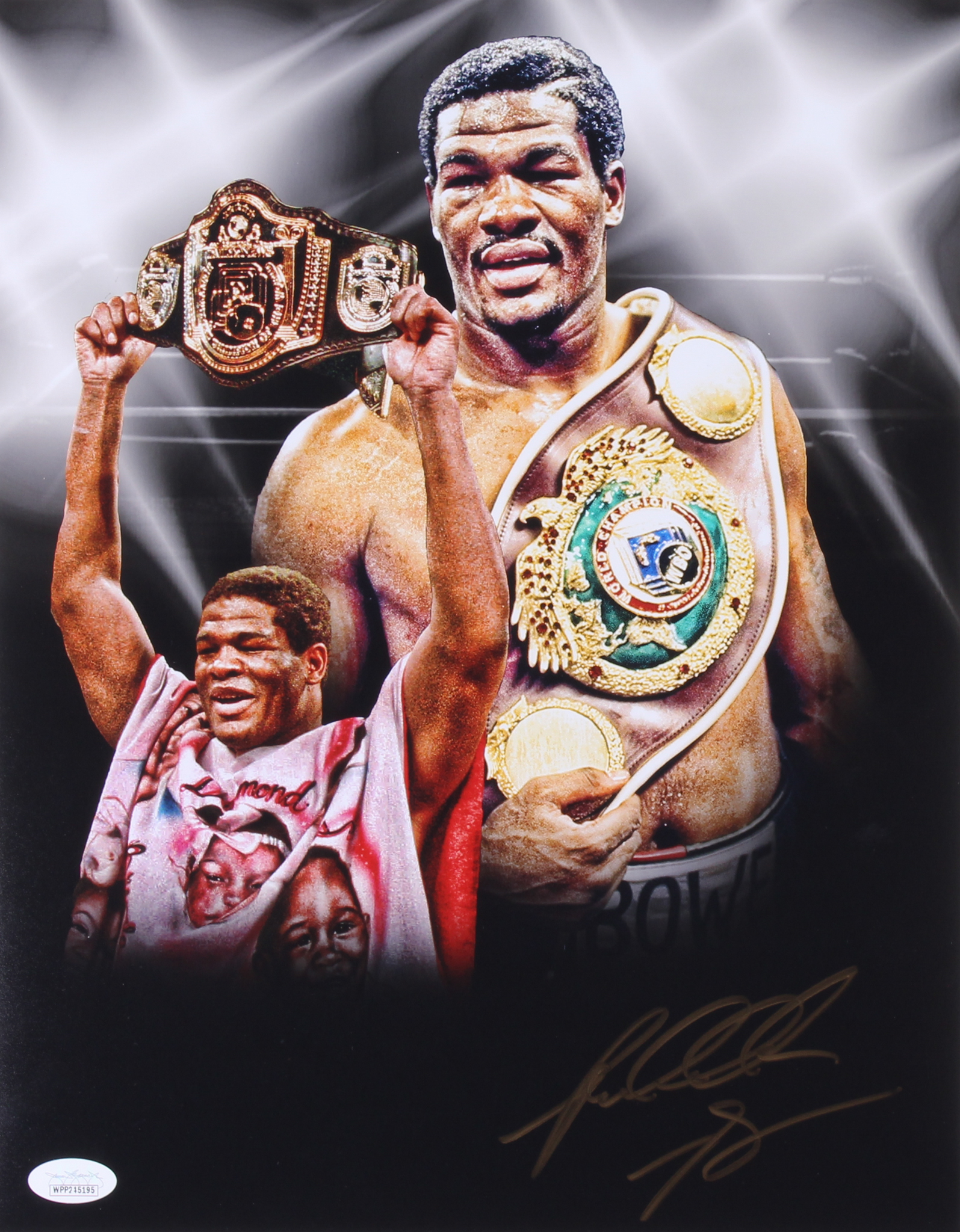 Photo measures 11" x 14" in size and has been hand-signed in gold paint pen by Riddick Bowe (HOF).