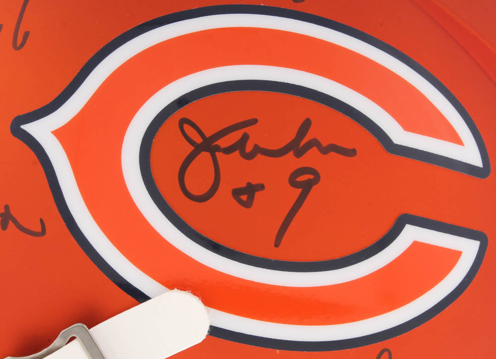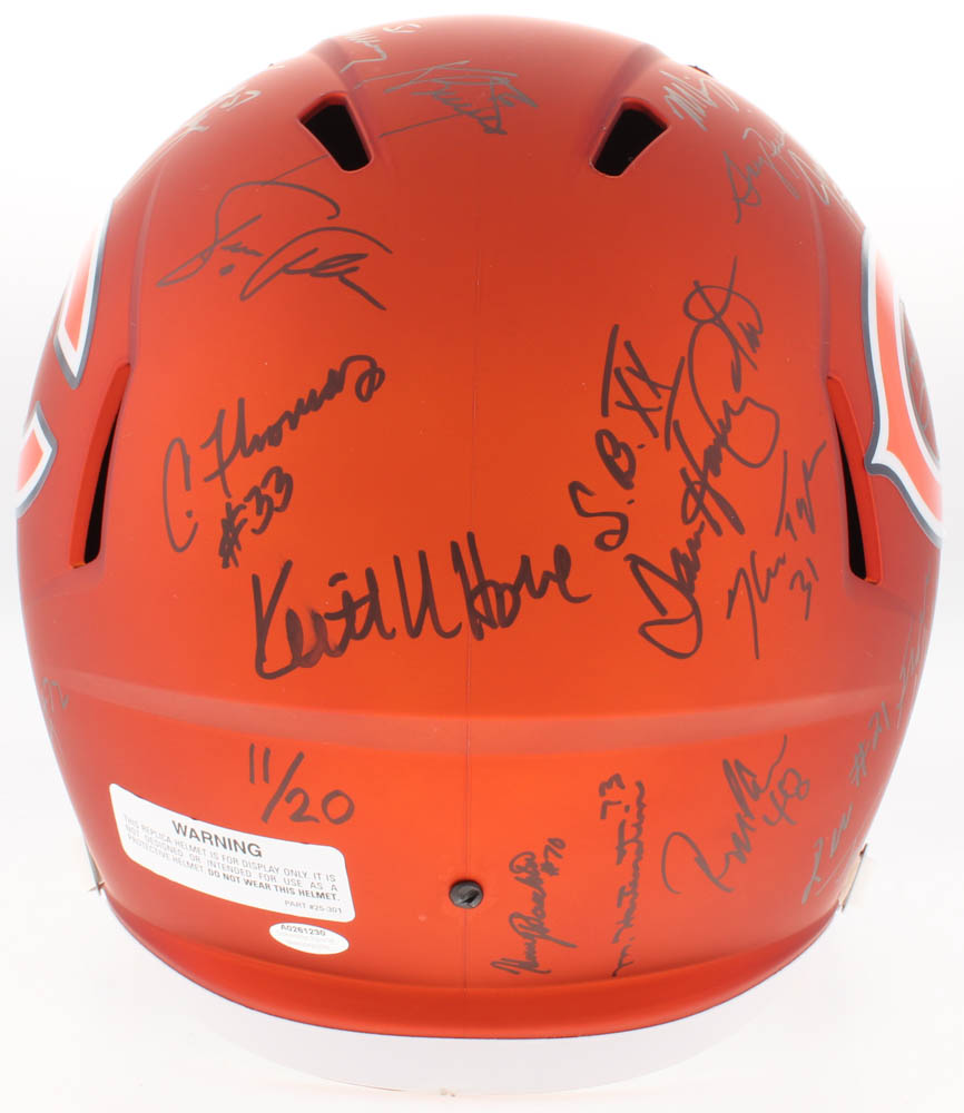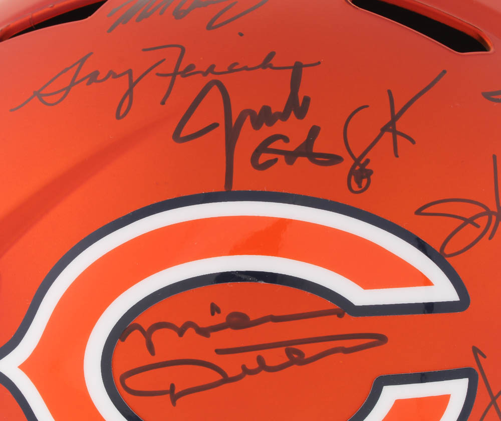 Riddell Chicago Bears full-size blaze speed replica helmet has been hand-signed in black felt-tip pen by (31) members of the 1985 Chicago Bears including Mike Ditka, Richard Dent, Jim McMahon, Mike Singletary, Dan Hampton, Wilber Marshall, Leslie Frazier, Jay Hilgenberg, Willie Gault, Gary Fencik, Jim Covert, Keith Van Horne, Tom Thayer, Mark Bortz, Steve Fuller, Kevin Butler, Mike Tomczak, Steve McMichael, Dennis McKinnon, Henry Waechter, Otis Wilson, Ken Taylor, Reggie Phillips, Emery Moorehead, Dennis Gentry, Jim Morrissey, Thomas Sanders, Calvin Thomas, Maury Buford, Mike Hartenstine, and William Perry. Please note, the helmet is limited edition and has been hand-numbered #11/20.