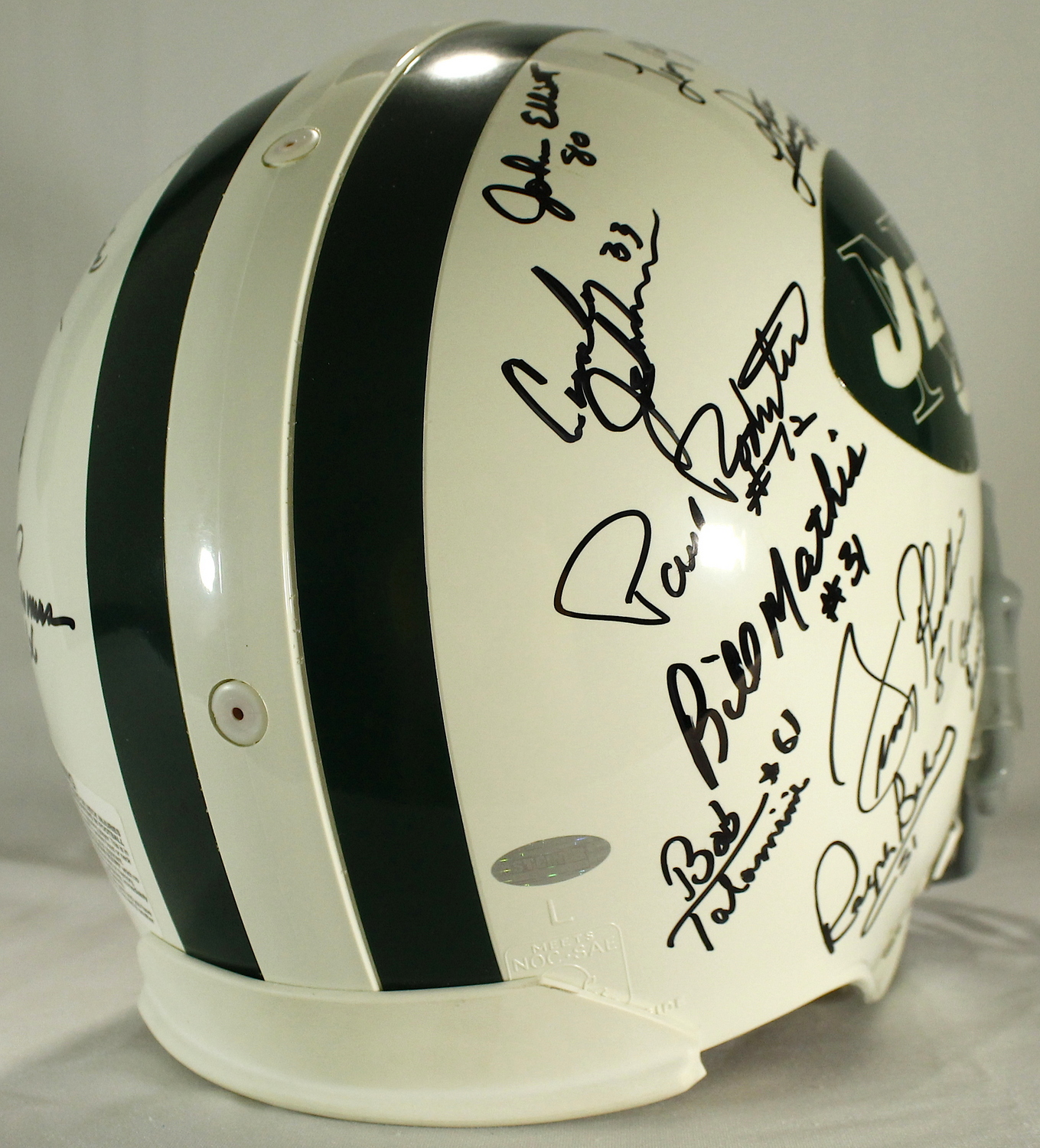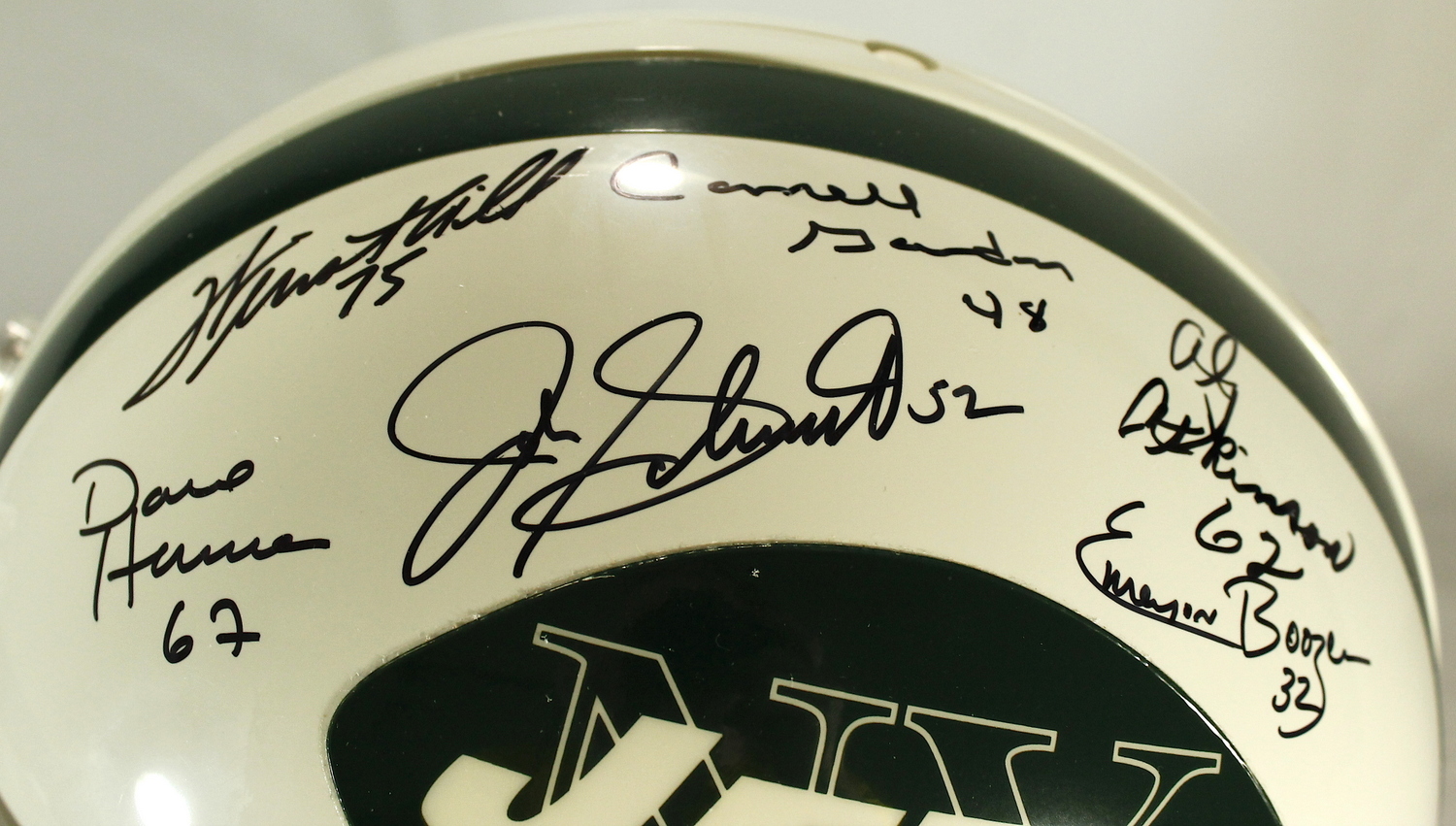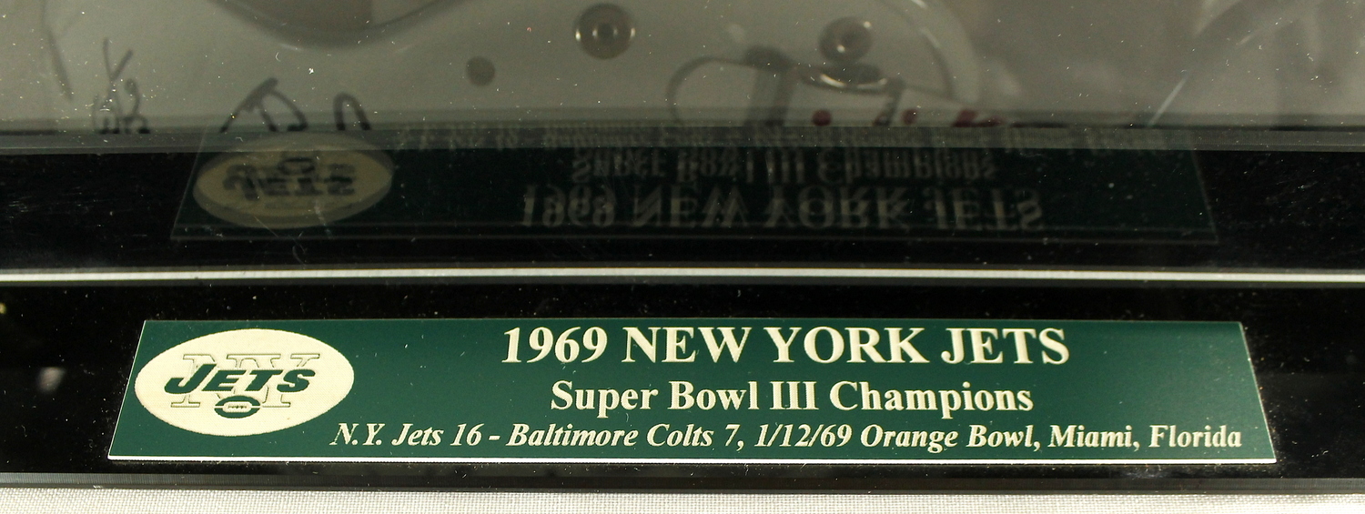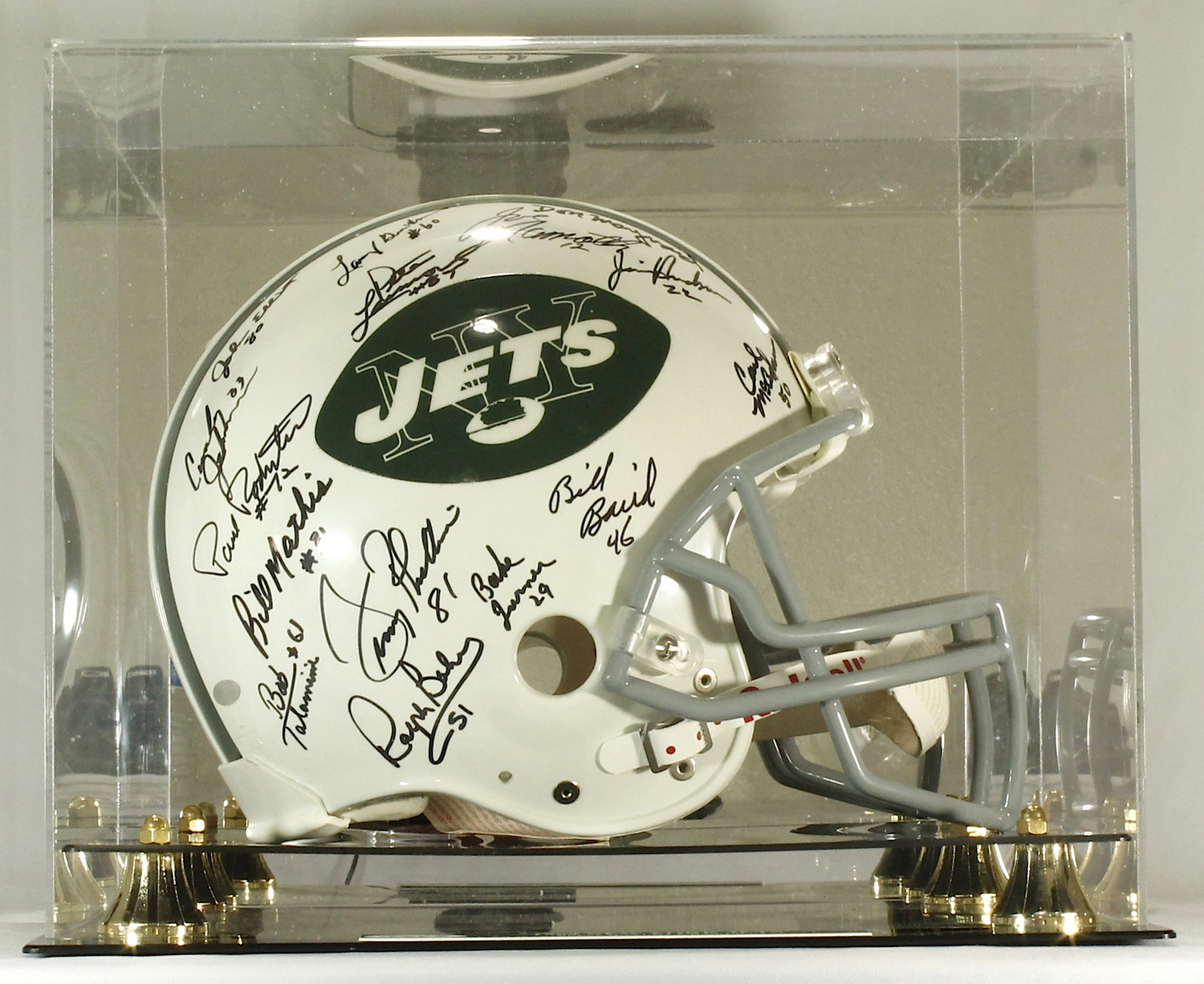 Full-size authentic pro-line Jets helmet. Hand-signed in black felt tip pen by 25 members of the 1969 New York Jets. Autographs include Joe Namath, Don Maynard, Emerson Boozer, Ralph Baker, John Elliott, Bake Turner, Larry Grantham, Bill Mathis and others. Includes the custom display case with custom nameplate as shown. The autograph includes an official Steiner hologram for authenticity purposes.