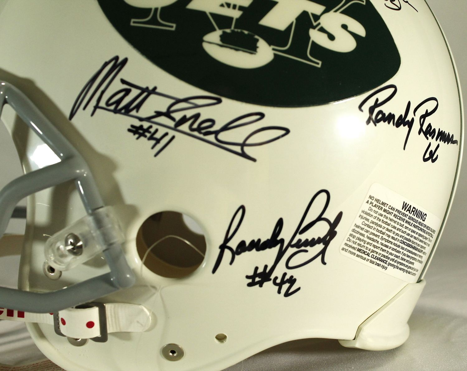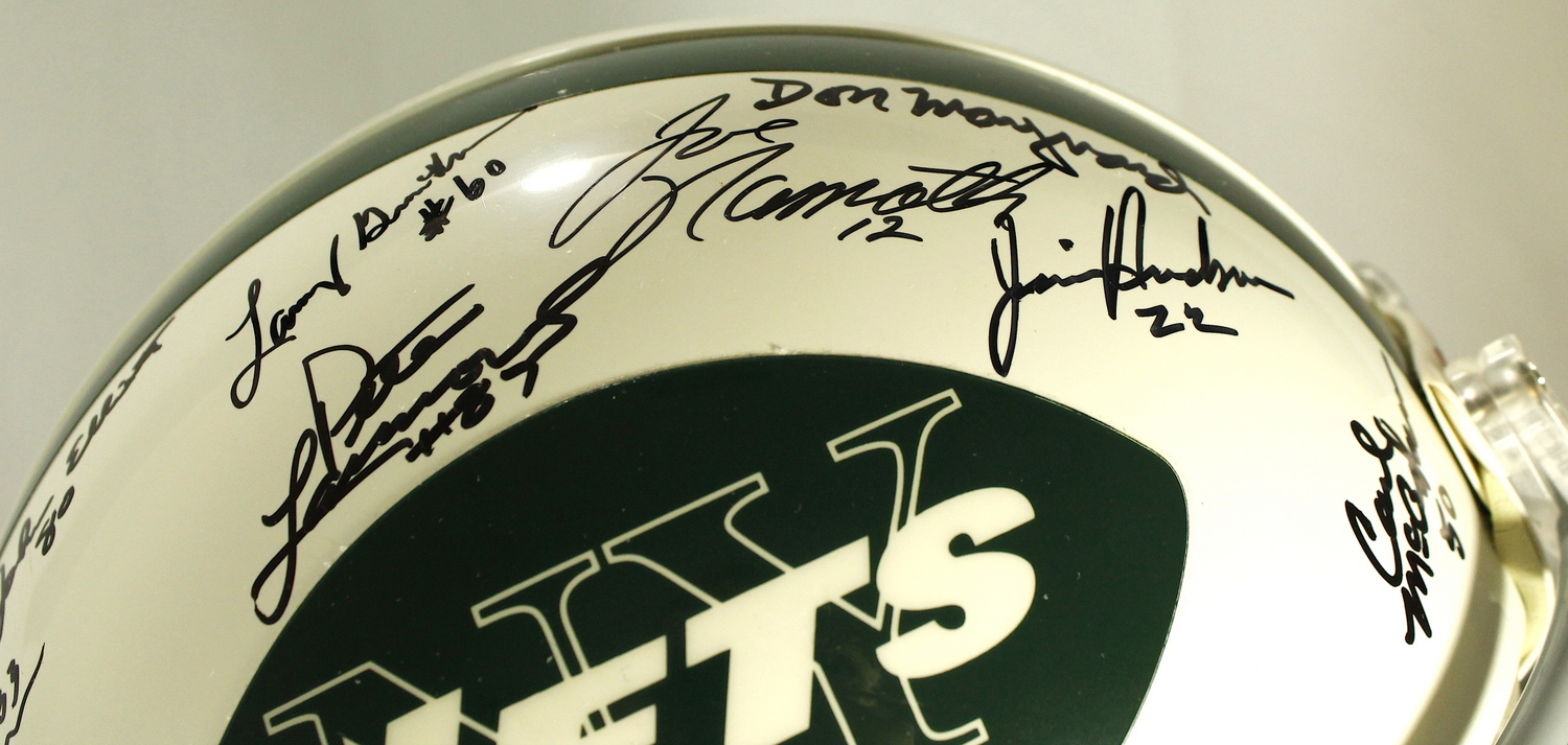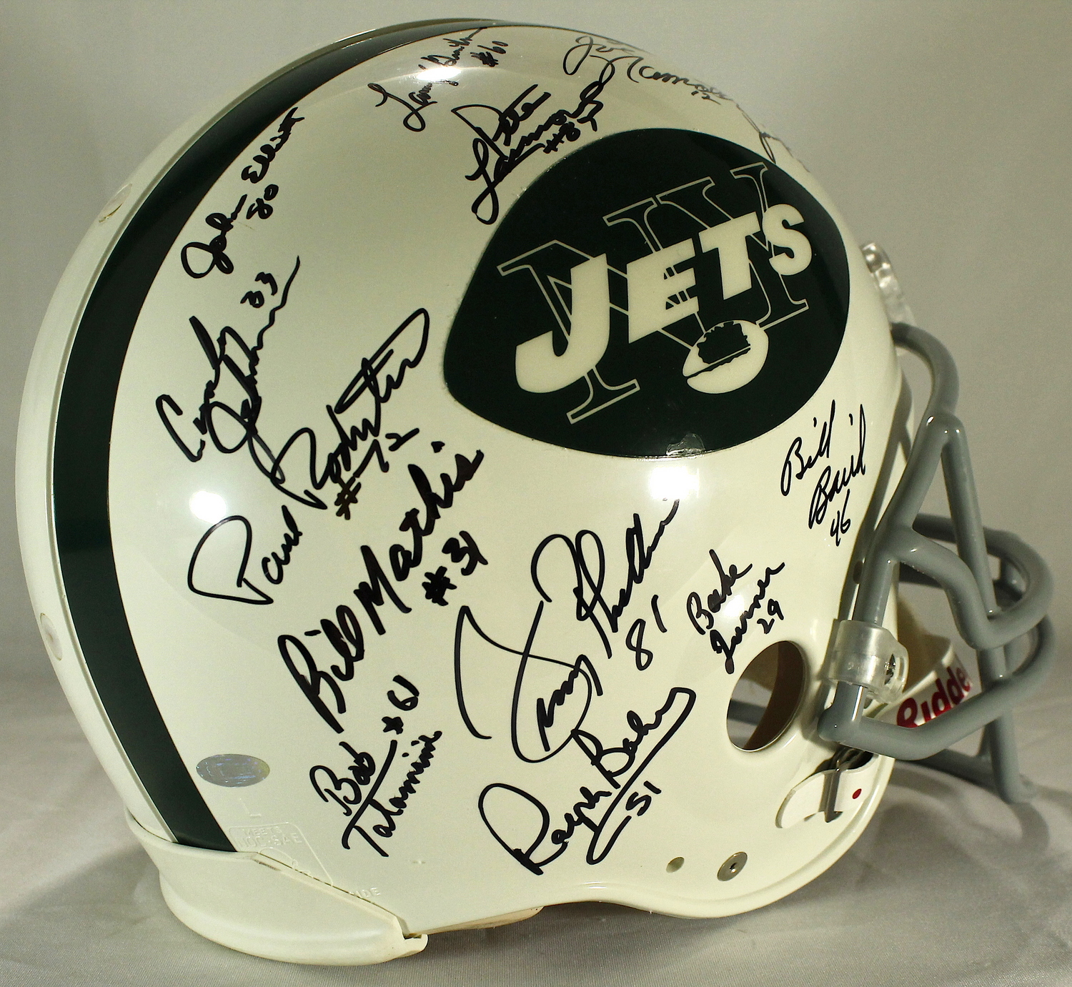Full-size authentic pro-line Jets helmet. Hand-signed in black felt tip pen by 25 members of the 1969 New York Jets. Autographs include Joe Namath, Don Maynard, Emerson Boozer, Ralph Baker, John Elliott, Bake Turner, Larry Grantham, Bill Mathis and others. Includes the custom display case with custom nameplate as shown. The autograph includes an official Steiner hologram for authenticity purposes.