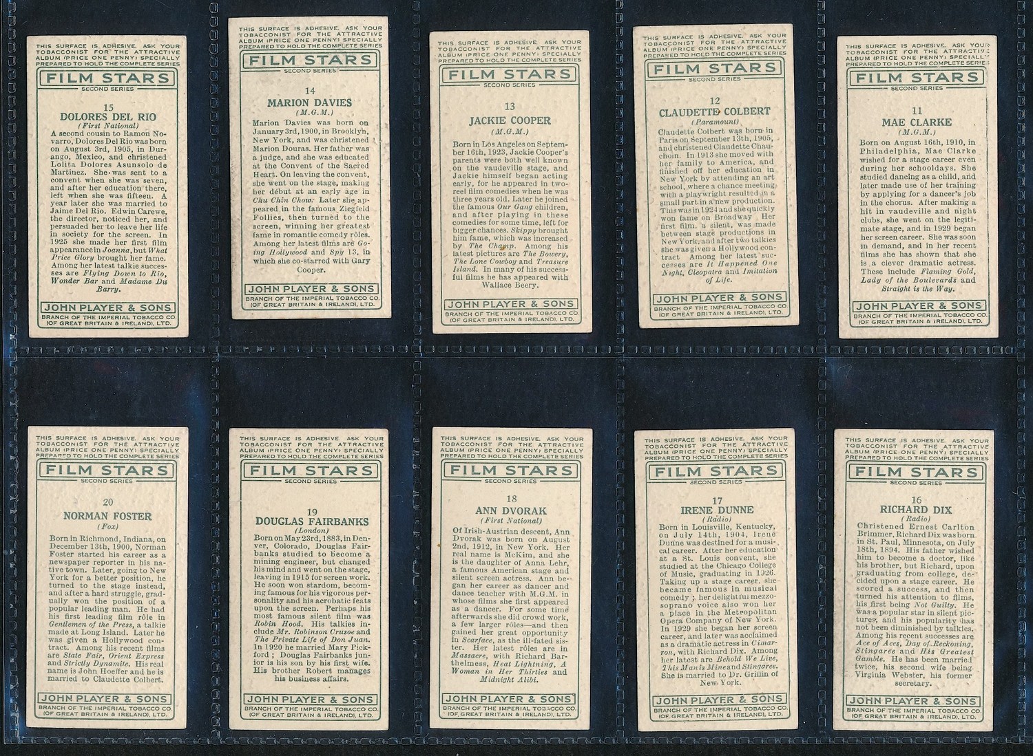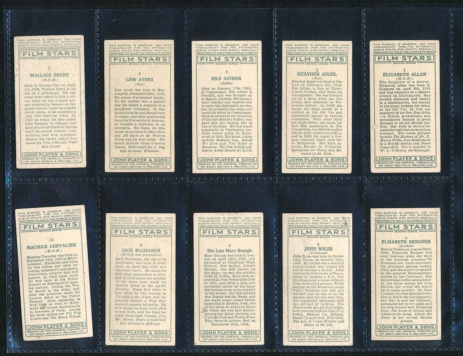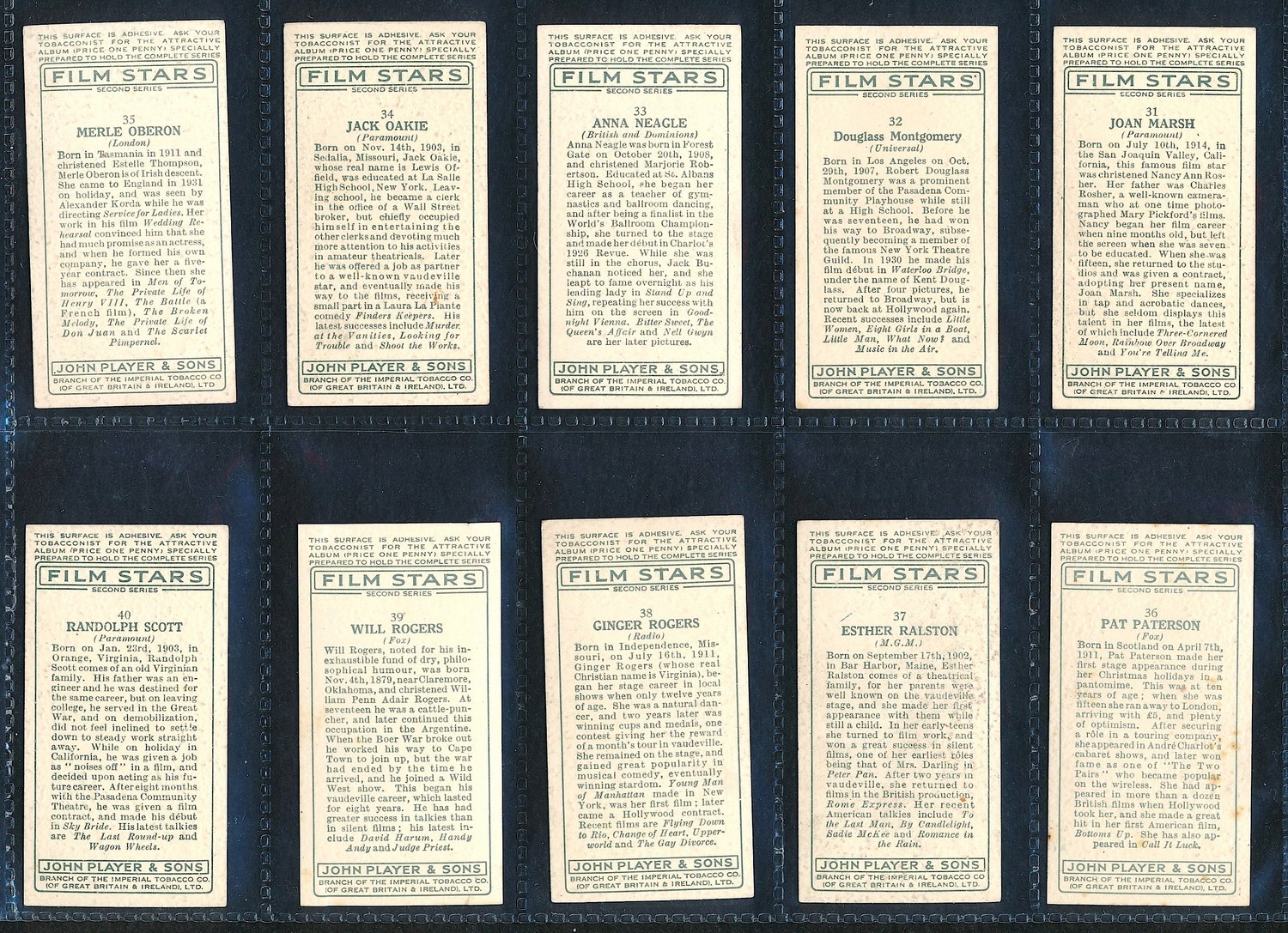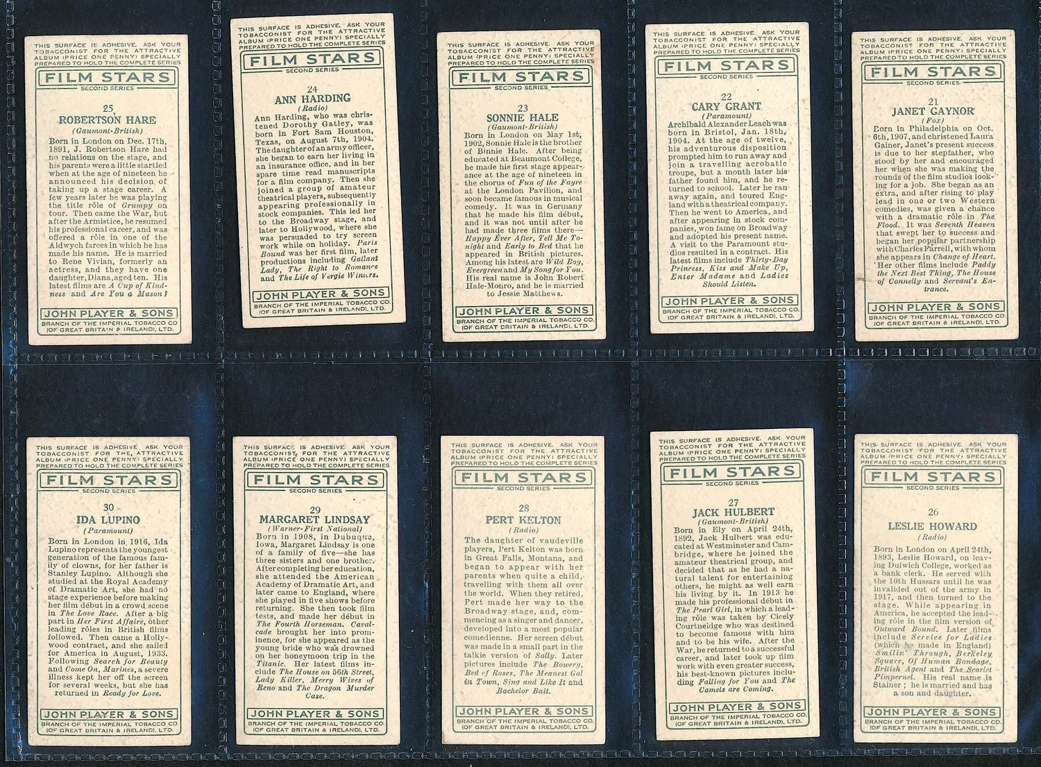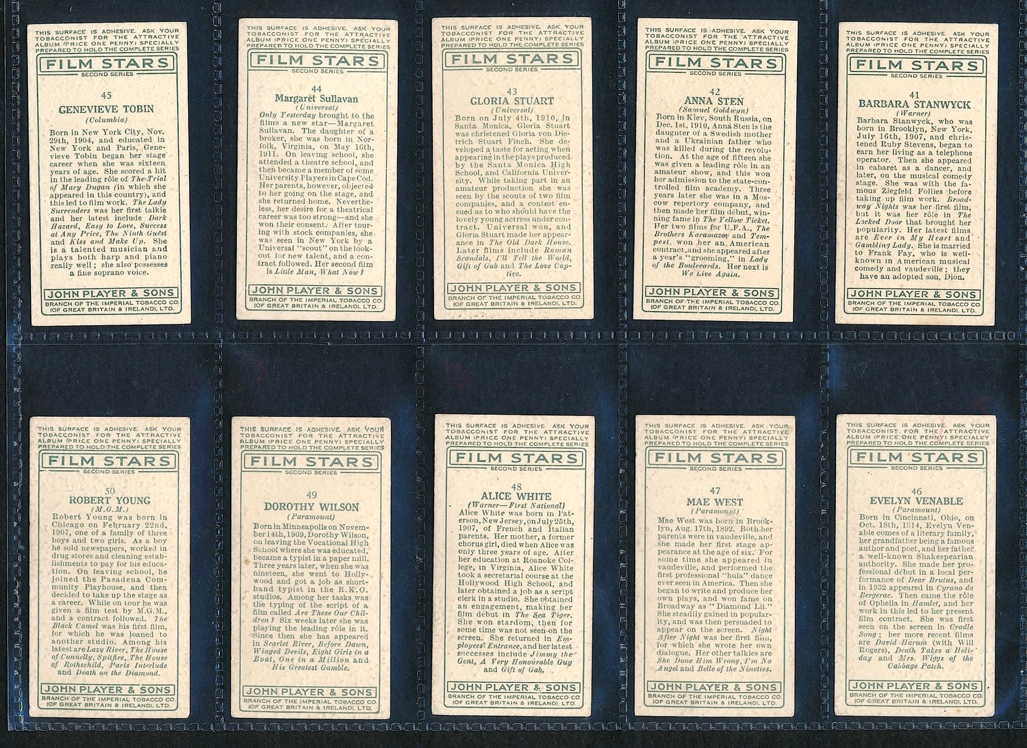 Lot of (50) Vintage "Film Star" Cigarette Cards From the Early 1900s. Includes Mae West, Cary Grant and others. The cards brand is Player's Cigarettes. Please see photos for details.
