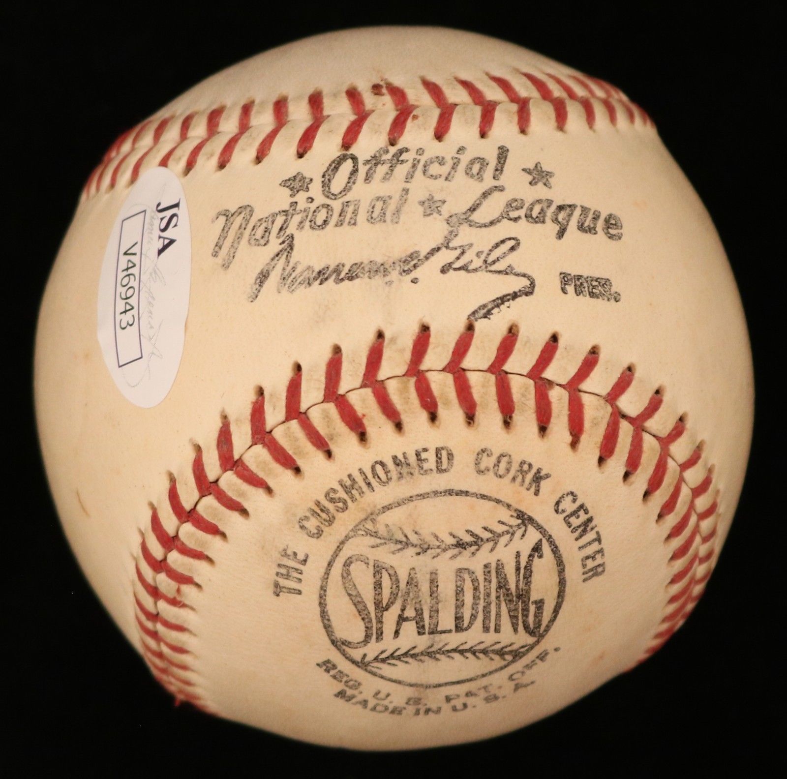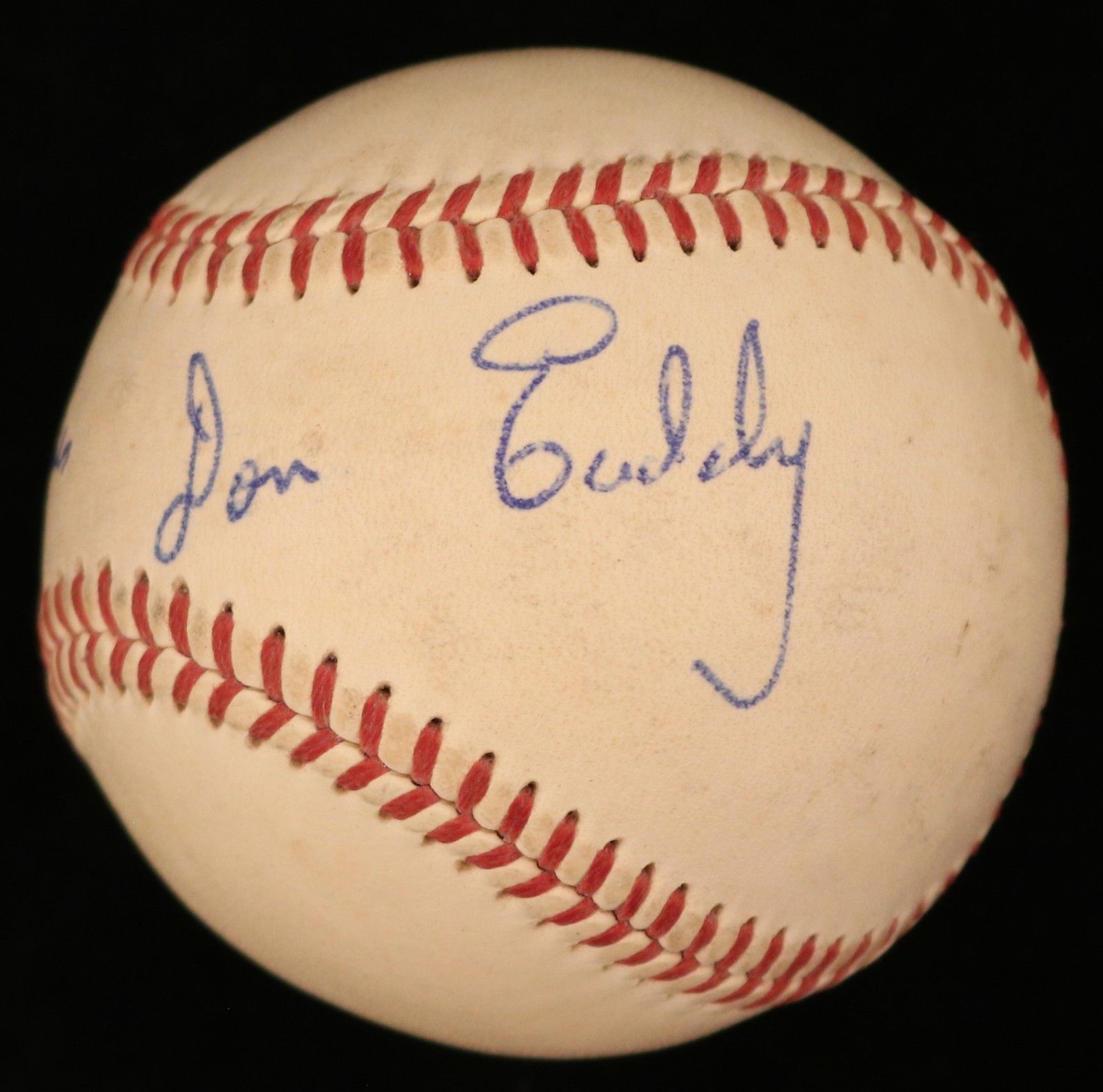 Spalding Official National League baseball. Hand-signed and inscribed in blue ink pen by Don Eaddy (D. 2008, Cubs). Please note, the baseball shows signs of natural toning.