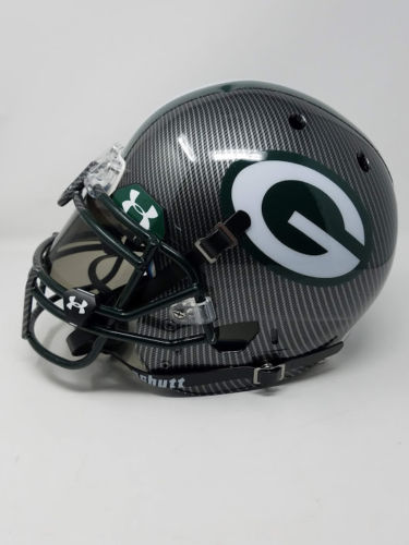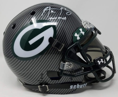 Schutt Packers custom hydro dipped grey full-size authentic on-field helmet. Hand-signed and inscribed in white paint pen by Aaron Rodgers. The helmet is limited edition and has been hand-numbered #12/12.