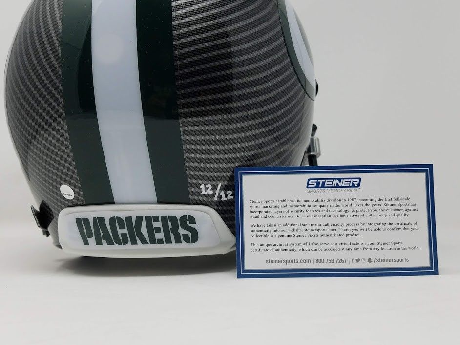 Aaron Rodgers was a first-round draft pick of the Green Bay Packers in the 2005 NFL Draft. Rodgers finally got the starting nod prior to the 2008 season and hasn't looked back since. Rodgers has led the Packers to the playoffs for two straight seasons 2009: 4.434 yards 30 TD a 7 INT 11-5 record and arguably did his best work in 2010 putting the Packers on his shoulders and leading them into the SB. On February 6th, 2011 Rodgers returned the Packers to glory leading them past the Pittsburgh Steelers in SB XLV. Aaron Rodgers is one of the best QB in the NFL today and should have the Pack competing for more SB titles for years to come. The signature on this item has been authenticated by Steiner Sports and features a uniquely numbered tamper-proof hologram which can be verified in our online database. This process ensures your item is authentic and prevents duplication and fraud. This helmet is limited to just 12 and you will receive number "12" from the edition.