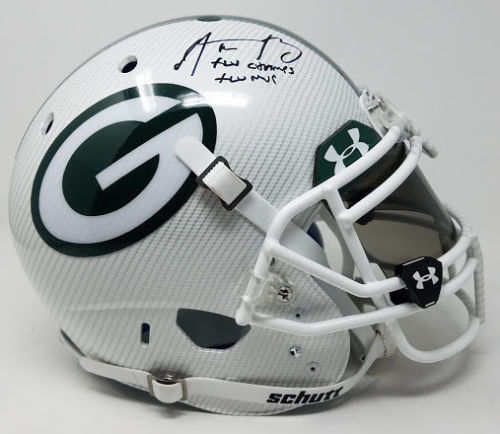 Schutt Packers custom hydro dipped white full-size authentic on-field helmet. Hand-signed and inscribed in black felt-tip pen by Aaron Rodgers. The helmet is limited edition and has been hand-numbered #1/12.