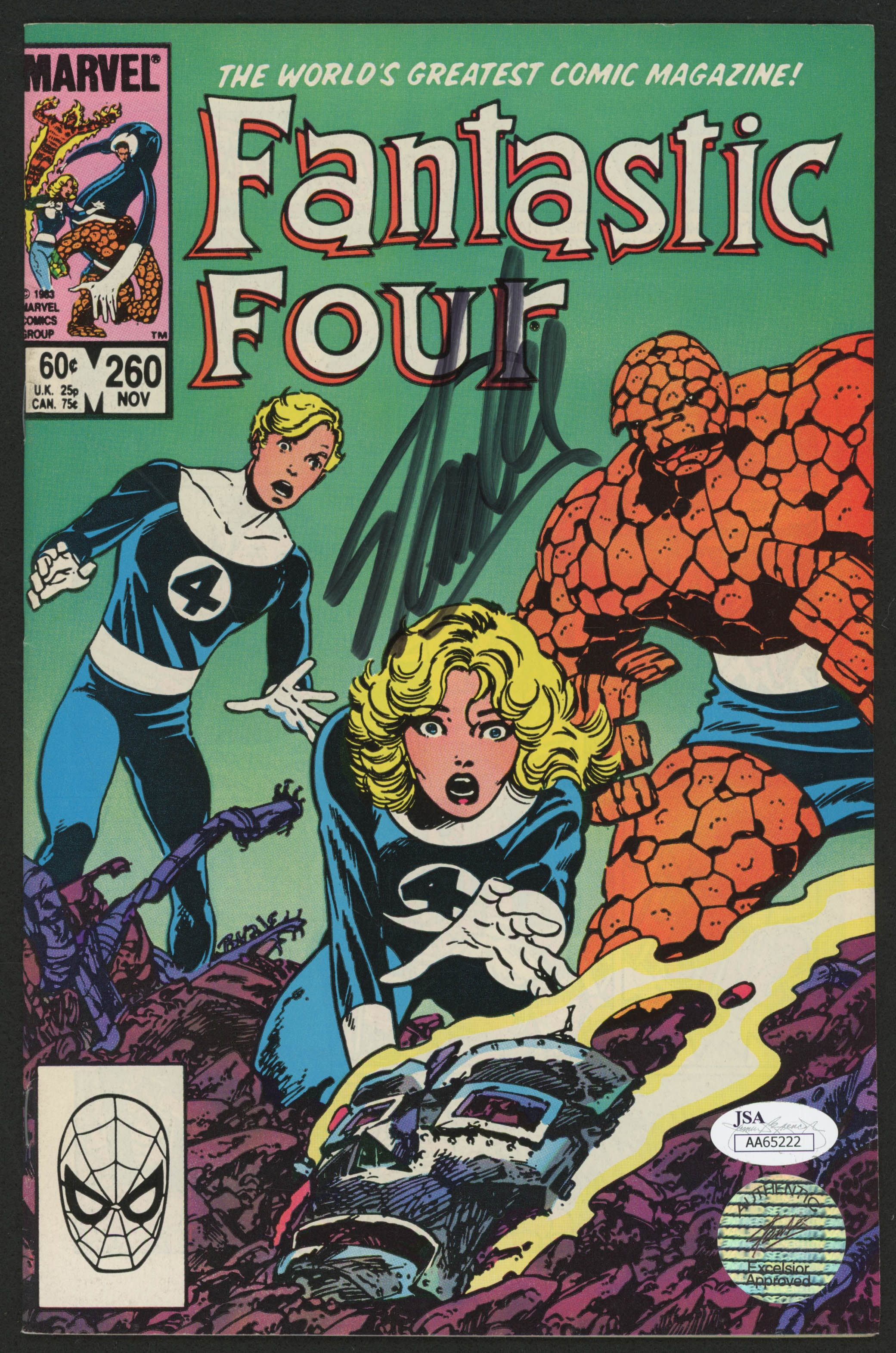 1983 "Fantastic Four" Issue #260 Marvel Comic Book. Hand-signed on the cover in black felt tip pen by Stan Lee (D. 2018).