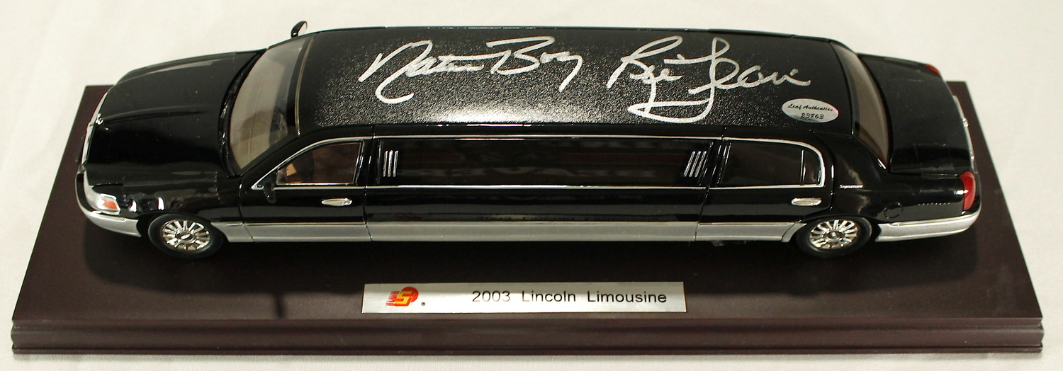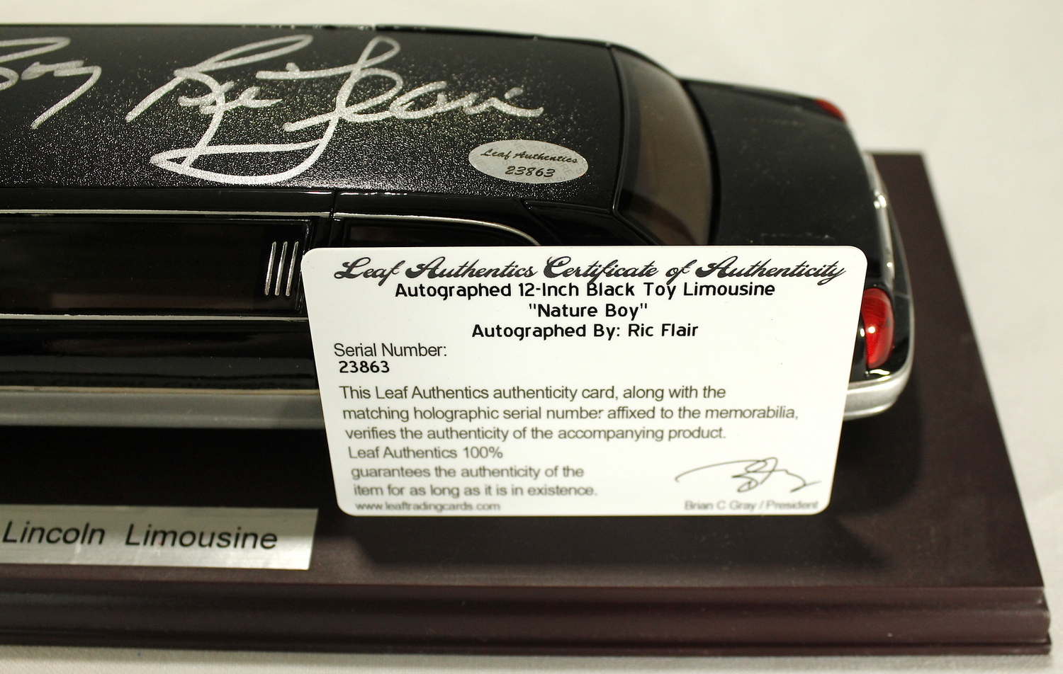 Die-cast 2013 Lincoln Limousine hand-signed and inscribed in silver paint-pen by WWE legend "Nature Boy" Ric Flair. The car measures approximately 12" in length. The autograph includes an official Leaf hologram and matching COA for authenticity purposes.