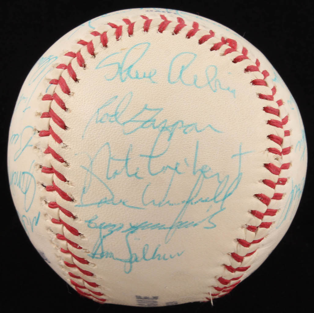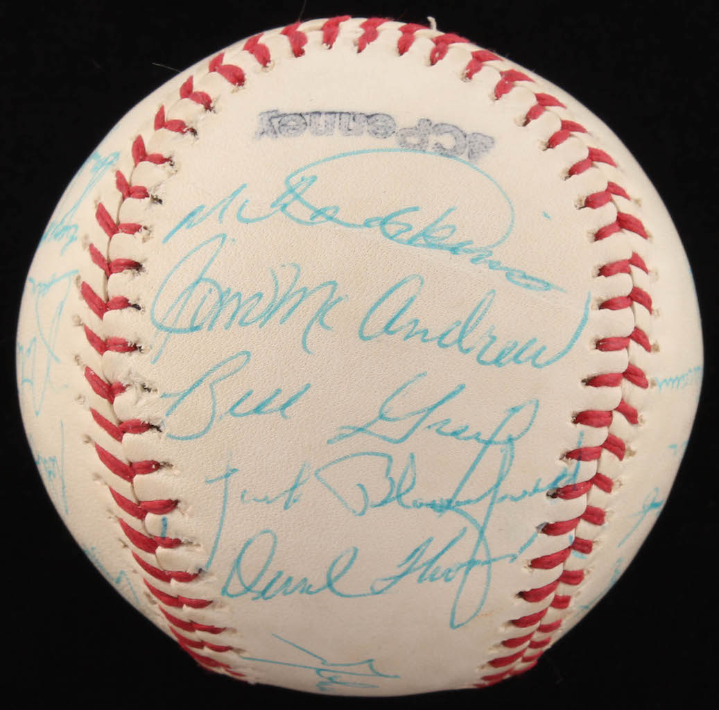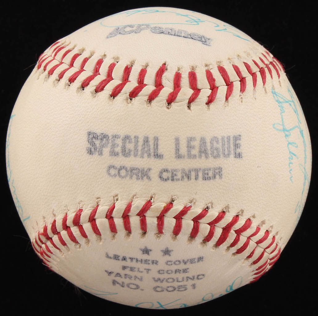 JC Penny Special League Leather Cover Baseball. Hand-signed in blue ink pen by Dave Winfield (rookie signature), John McNamara (Manager), Cito Gaston, Dave Roberts, Randy Jones, Whitey Wietelmann (Coach), Glenn Beckett, Steve Arlin, Rod Gaspar, Nate Colbert, Bernie Williams, Dan Spillner, Mike Corkins, Jim McAndrew, Bill Greif, Jack Bloomfield (Coach), Derrel Thomas, Fred Kendall, Bob Barton, Vicente Romo, and Matty Alou. Please note: the baseball shows signs of natural toning.