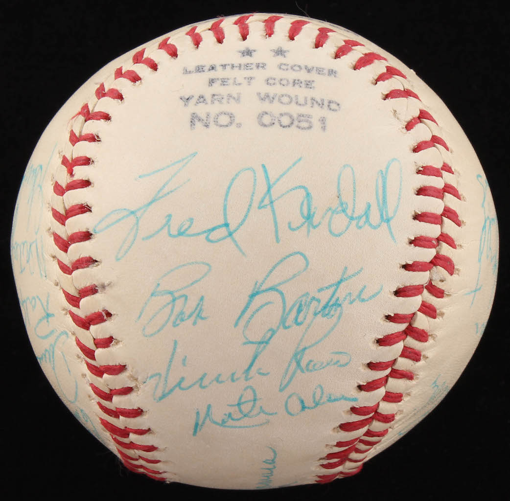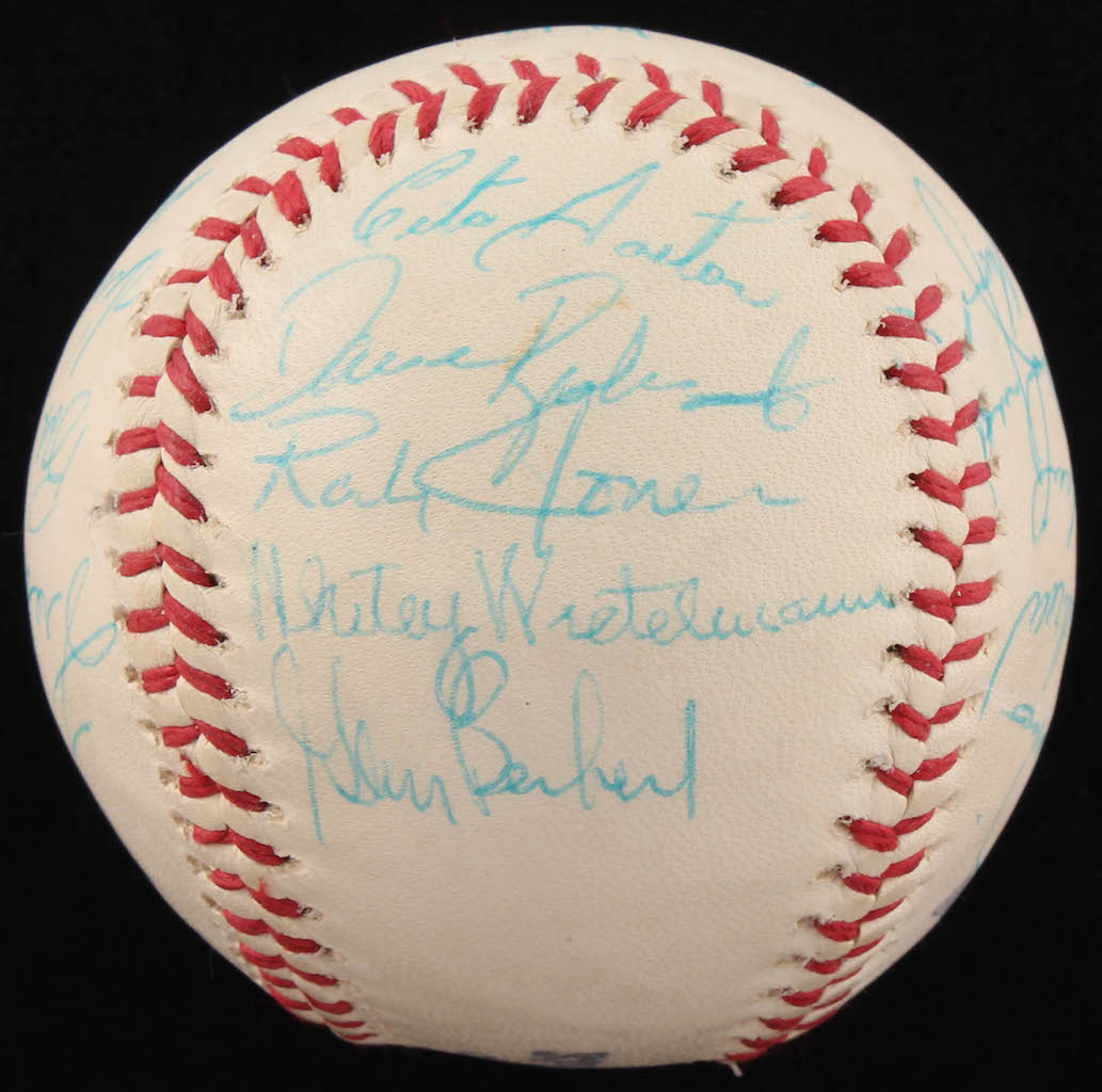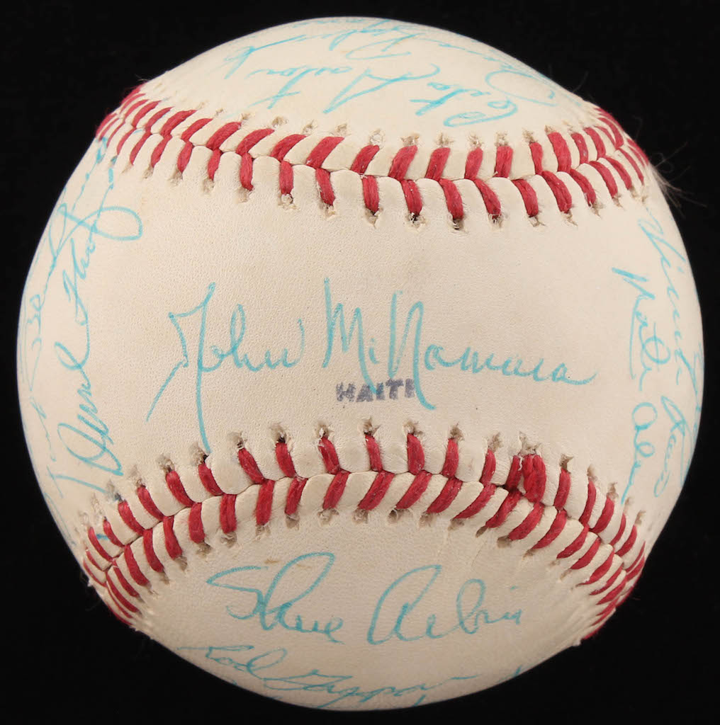 JC Penny Special League Leather Cover Baseball. Hand-signed in blue ink pen by Dave Winfield (rookie signature), John McNamara (Manager), Cito Gaston, Dave Roberts, Randy Jones, Whitey Wietelmann (Coach), Glenn Beckett, Steve Arlin, Rod Gaspar, Nate Colbert, Bernie Williams, Dan Spillner, Mike Corkins, Jim McAndrew, Bill Greif, Jack Bloomfield (Coach), Derrel Thomas, Fred Kendall, Bob Barton, Vicente Romo, and Matty Alou. Please note: the baseball shows signs of natural toning.