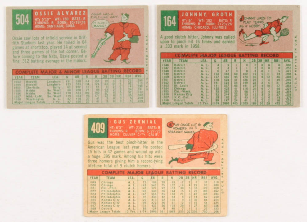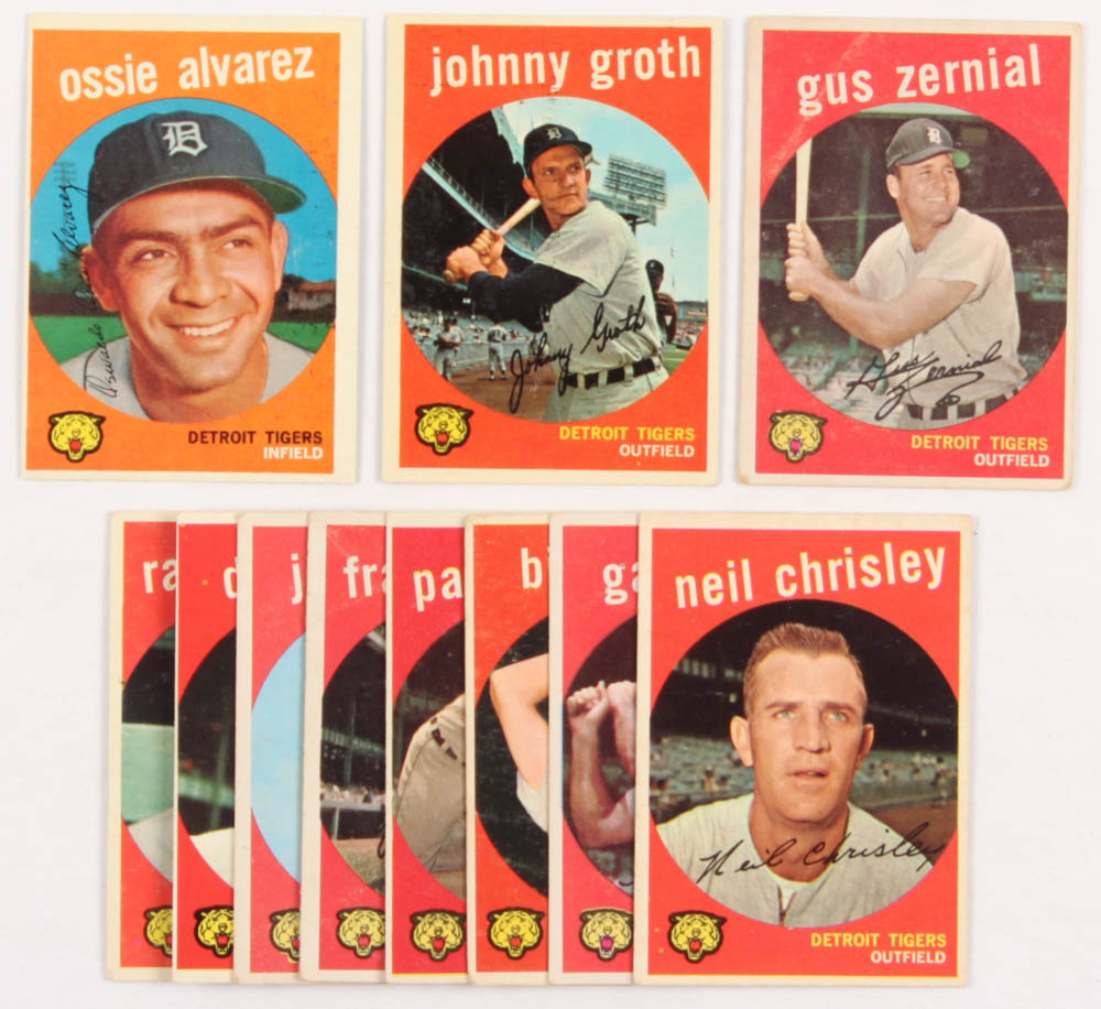 Lot of (11) Tigers 1959 Topps Baseball Cards with #504 Ossie Alvarez Rookie Card, #409 Gus Zernial, #164 Johnny Groth, #189 Neil Chrisley