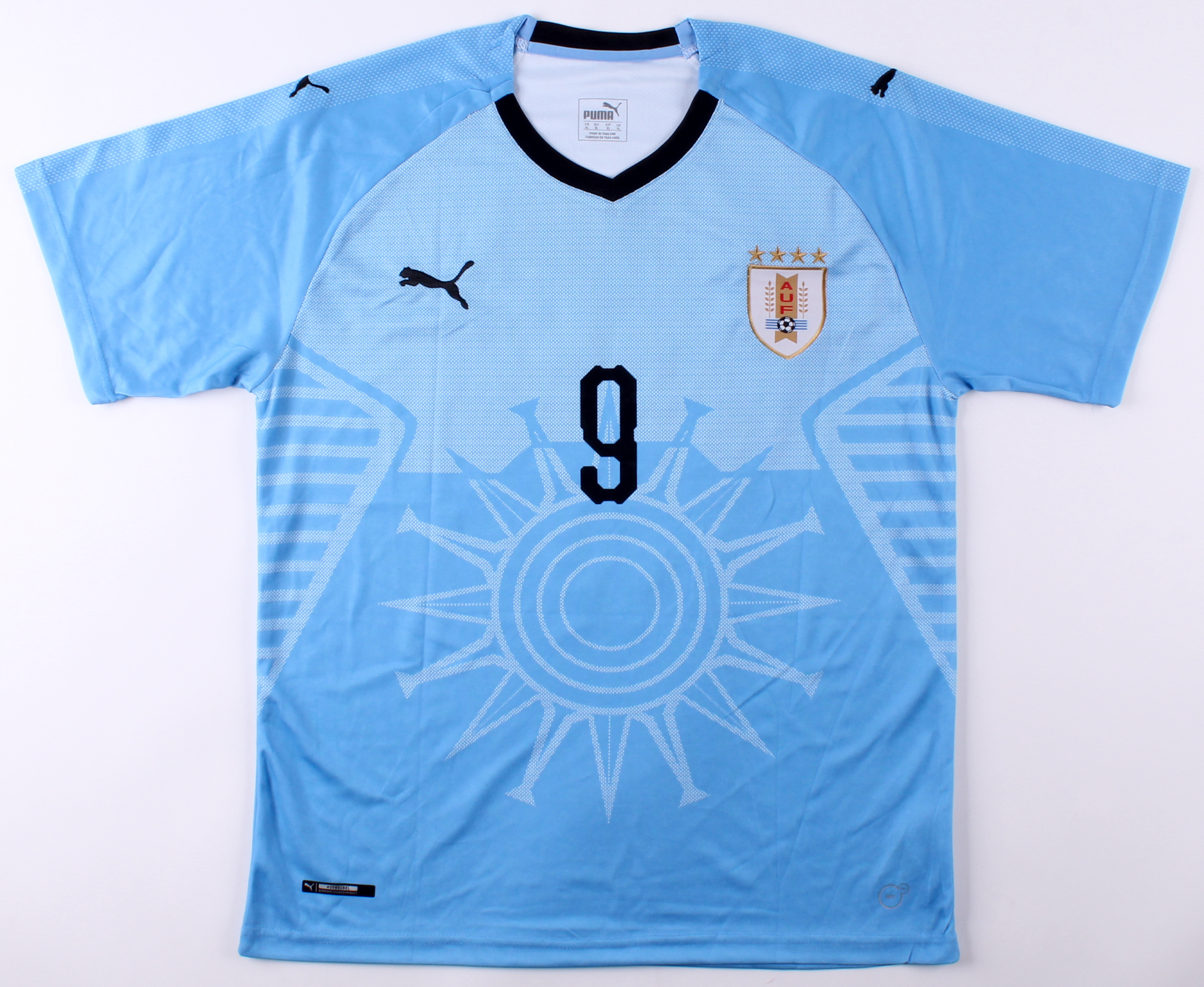 Puma on-field style jersey. Everything printed on, size XL. Hand-signed in silver paint pen by Luis Suarez.