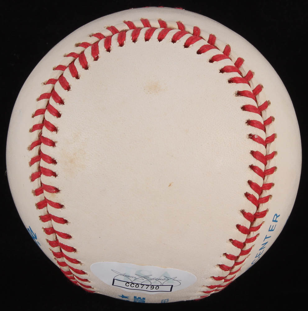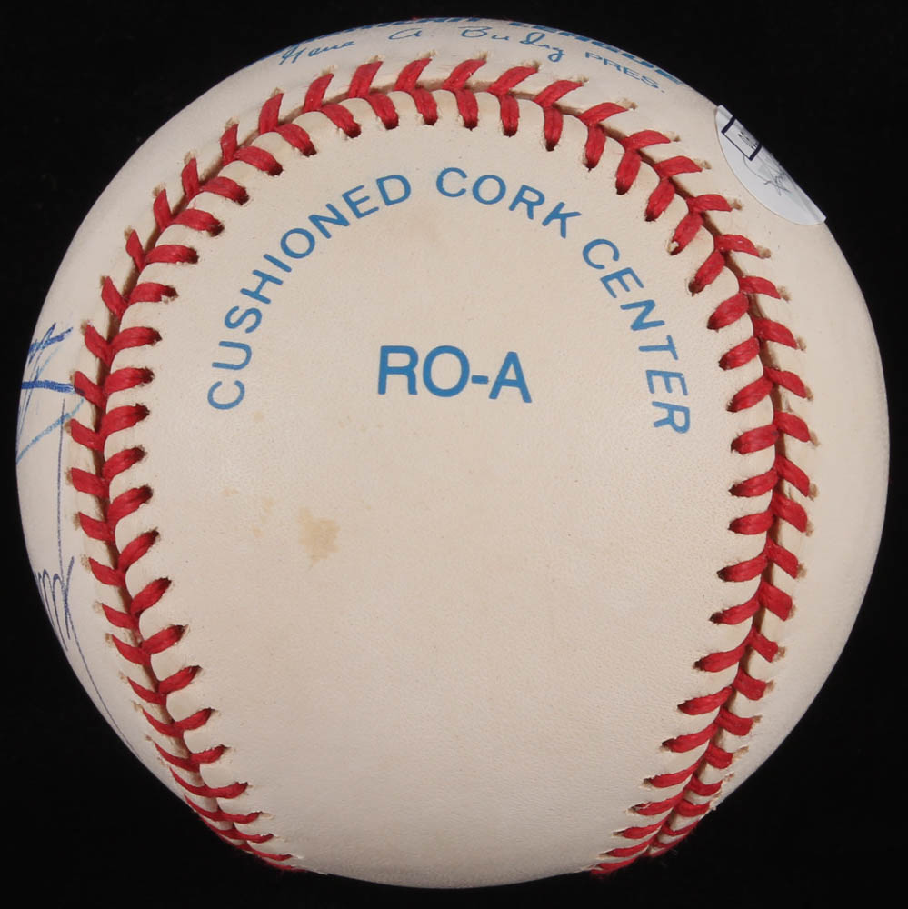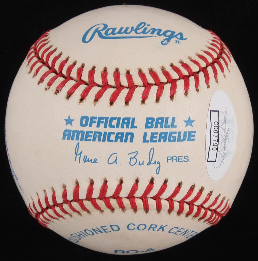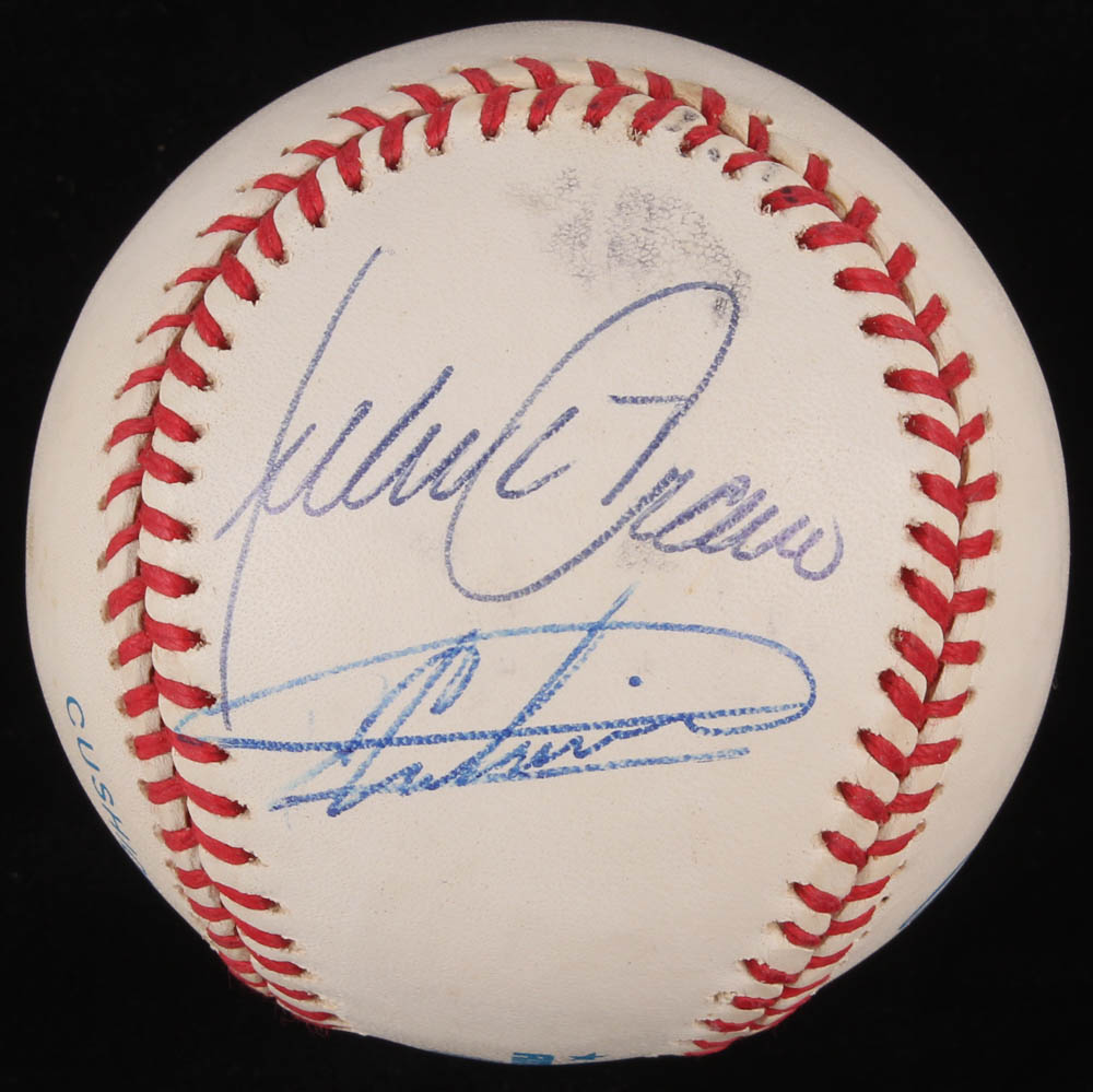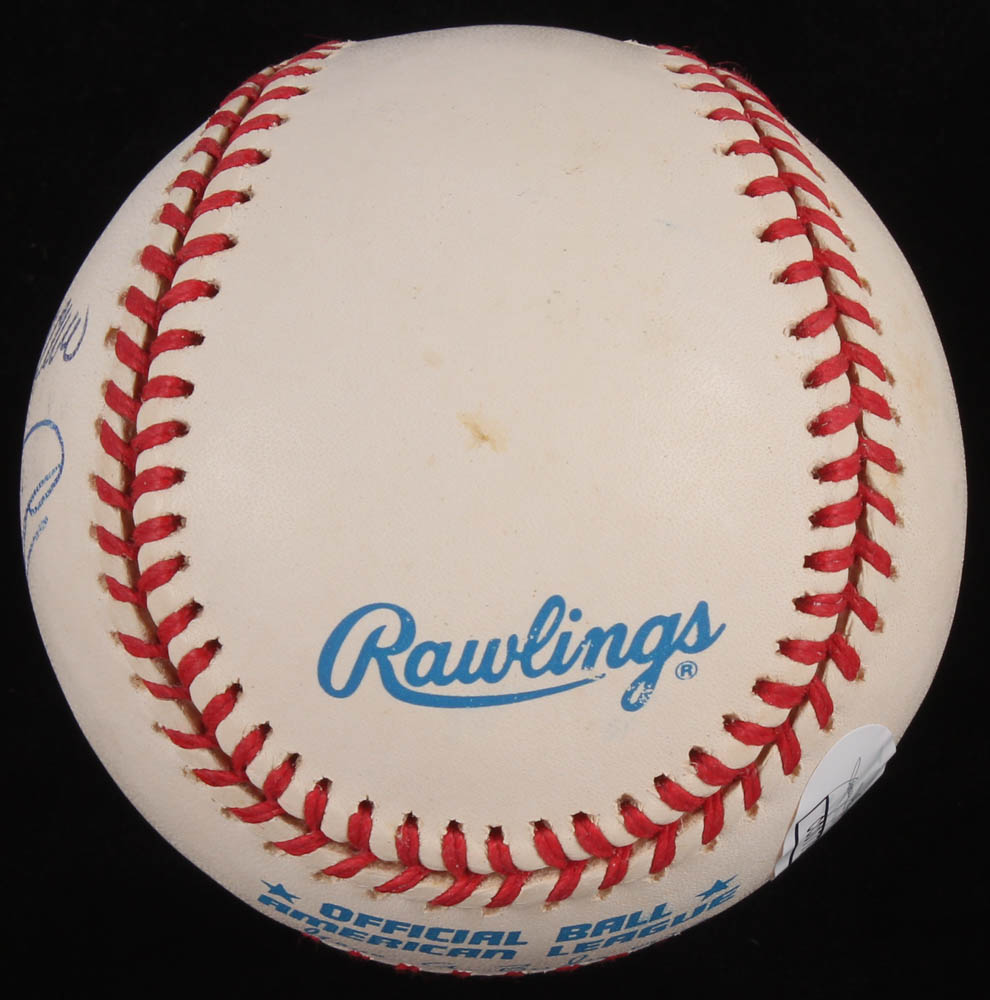 Rawlings Official American League baseball. Hand-signed in blue ink pen by Julio Franco (Indians) and (1) other. Please note, the baseball shows signs of natural toning.