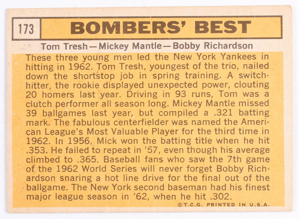1963 Topps #173 Bomber's Best / Tom Tresh / Mickey Mantle / Bobby Richardson