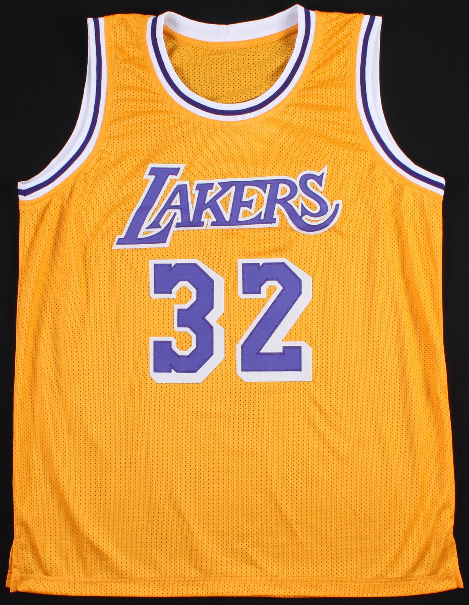 Custom on-court style jersey. Everything is sewn on, size XL. Hand-signed in black felt-tip pen by Magic Johnson (HOF).