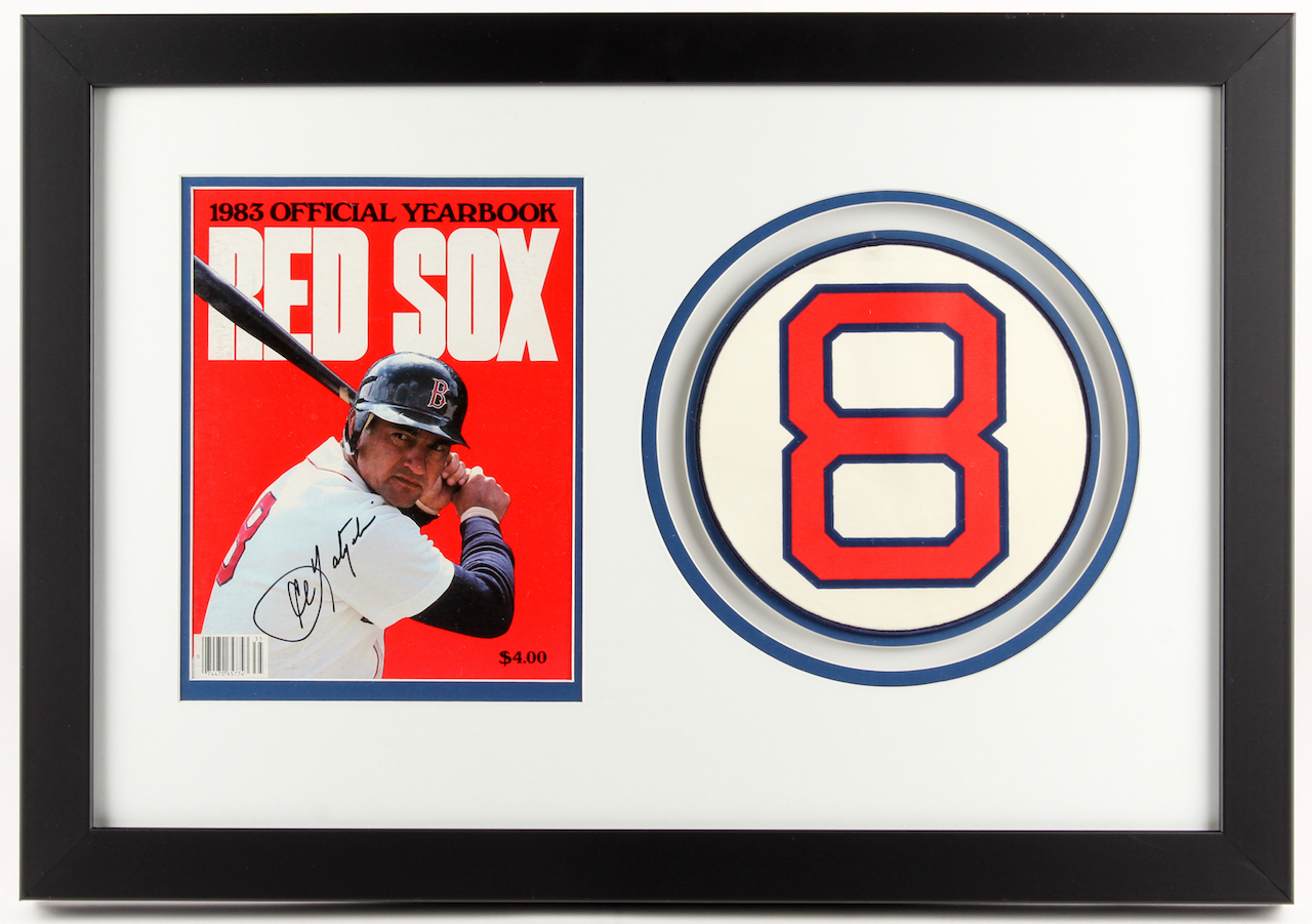 Custom framed display measures approximately 18.5" x 26" in size and features a yearbook that has been hand-signed in black felt-tip pen by Carl Yastrzemski (HOF). The frame also includes a #8 Jersey Patch.