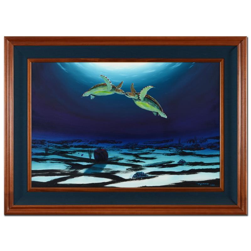"Sea Turtle Below (With Reef)" is an original oil painting on canvas by Wyland, hand signed by the artist. This piece comes framed. Includes Certificate of Authenticity. Measures approx. 45.5" x 33" (frame), 36.5" x 23.5" (image). There is minor wear on the corners and edges of the frame.