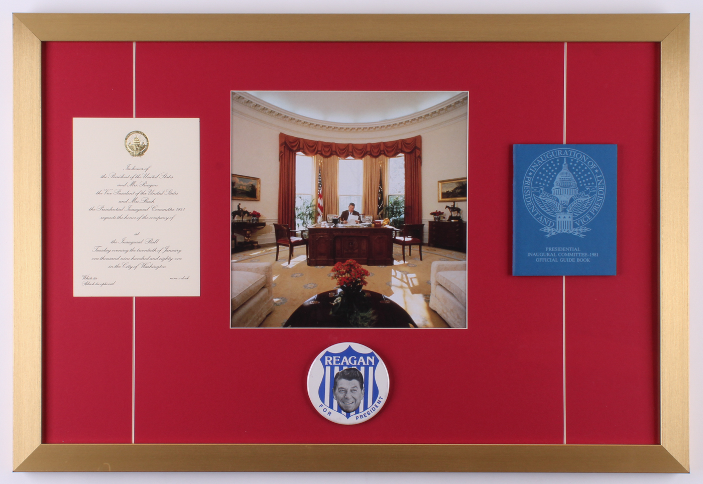 Custom framed display measures 19" x 28". Features a photo of Ronald Reagan. This display also includes a vintage campaign pin, Inauguration Guide Book, and Inaugural Ball Invitation. Please note, the items are not signed.