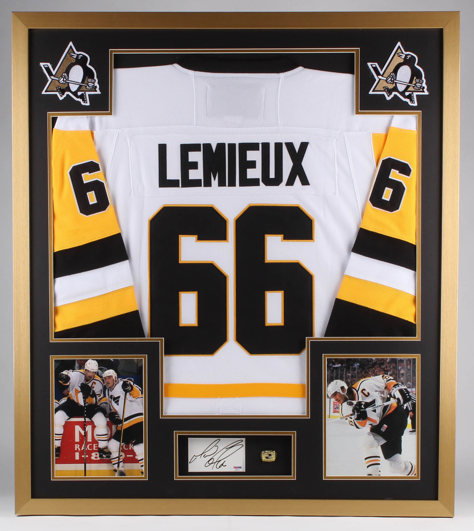 Custom frame measures 32" x 36" in size. Features a cut that has been hand-signed in black felt-tip pen by Mario Lemieux (HOF). The display also features a custom on-ice style jersey, (2) Penguins patches, (2) photos of Lemieux as well as (1) replica championship ring.