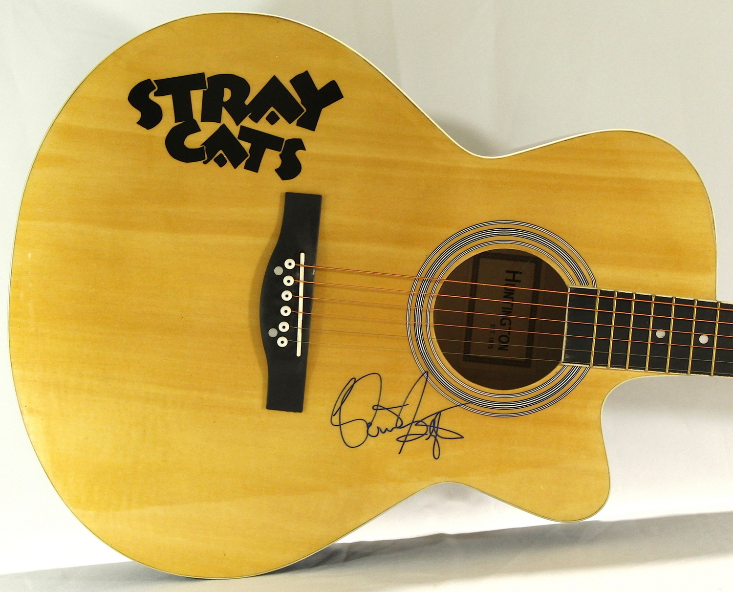 Full-size acoustic guitar hand-signed on a clear pickguard in blue felt tip pen by Brian Setzer. The autograph includes a James Spence Authentication (JSA) Auction House LOA for authenticity purposes.