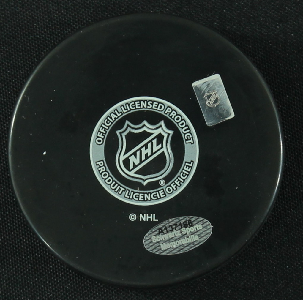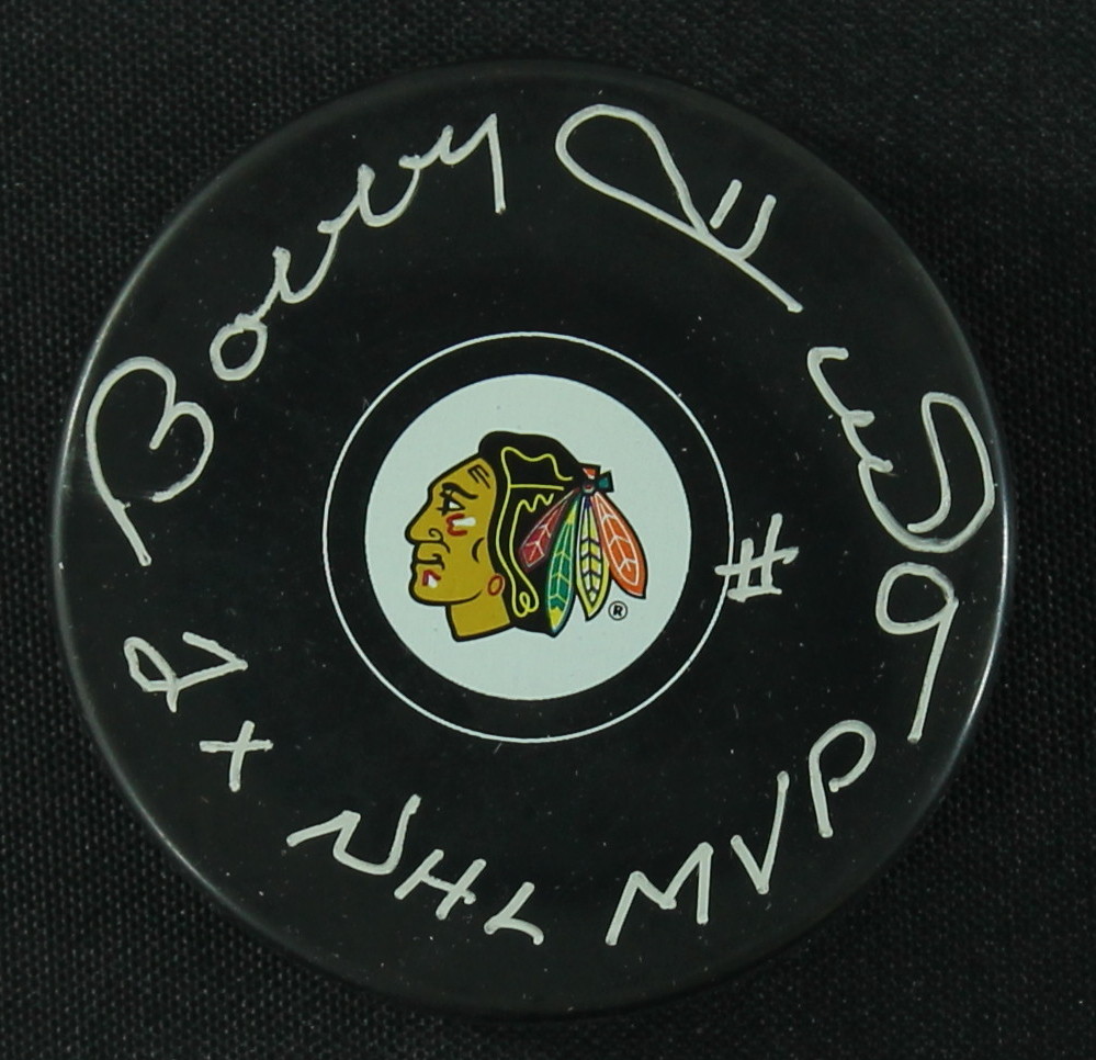 Chicago Blackhawks logo hockey puck. Hand-signed and inscribed in silver paint-pen by Bobby Hull (HOF). The autograph includes an official Schwartz Sports Hologram and matching COA for authenticity purposes.