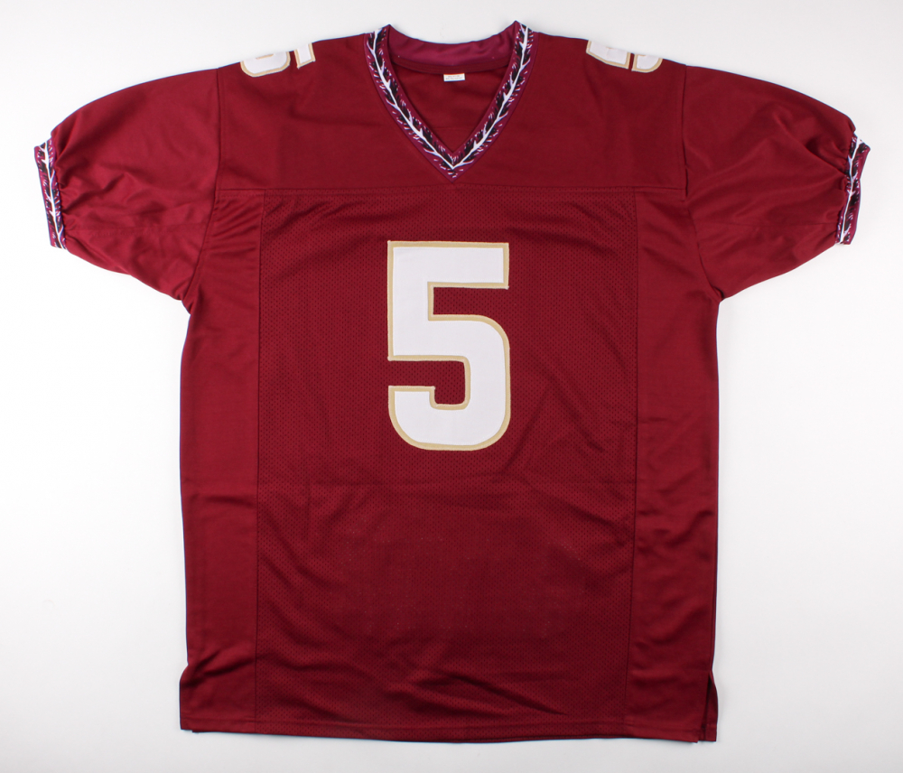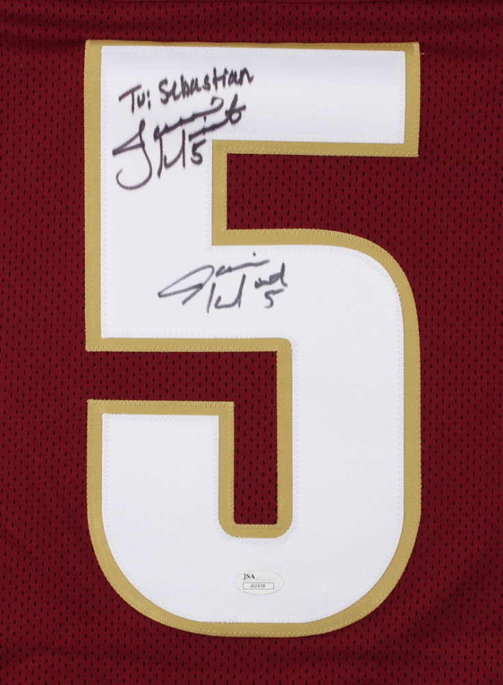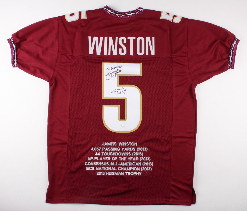 Custom on-field style jersey. Everything sewn on, size XL. Hand-signed (2) times in black felt-tip pen by Jameis Winston. Winstons's career highlights have been custom stitched onto the back of the jersey below the reverse numbers. Please note jerey has been personalized to Sebastian.