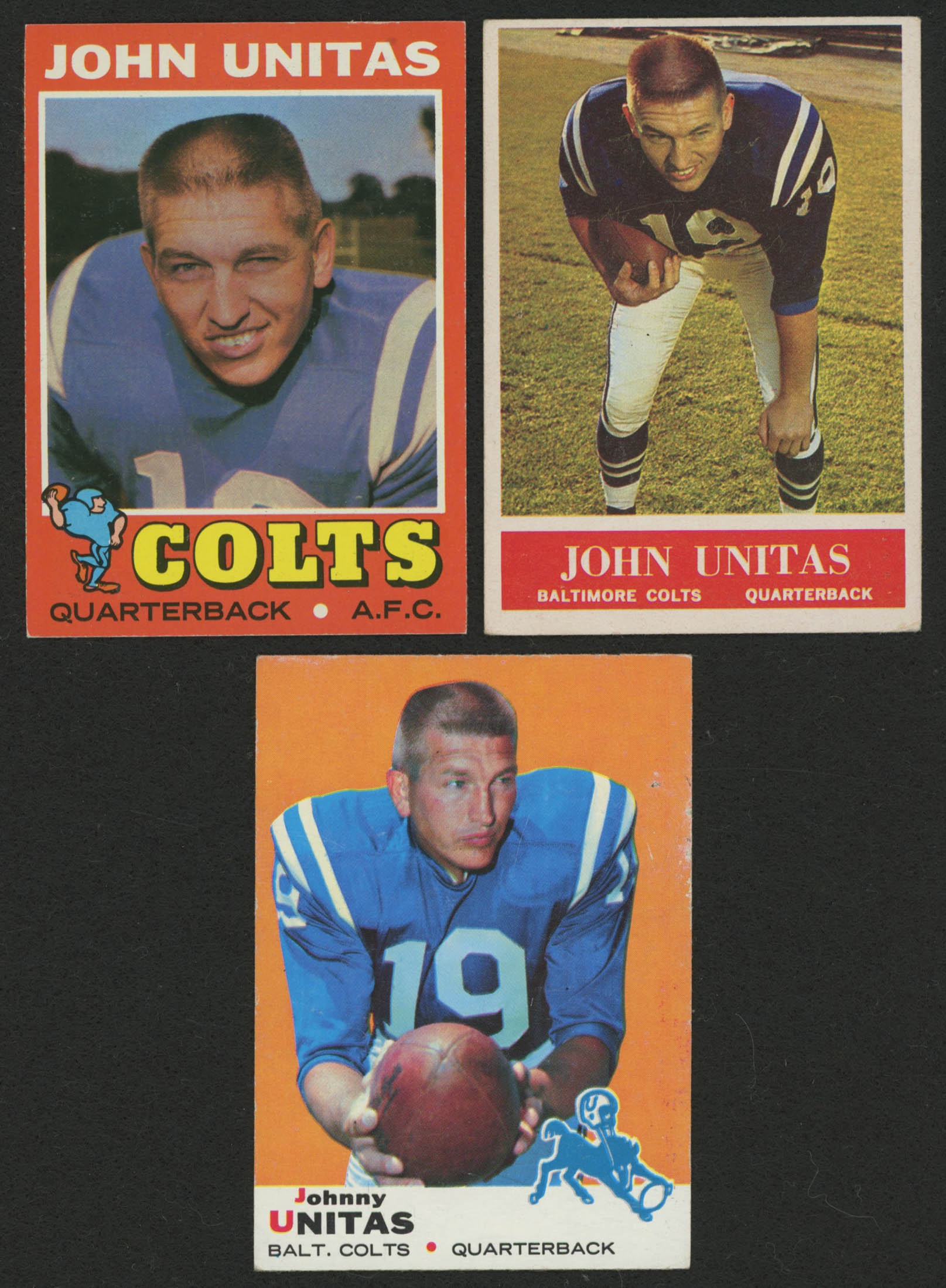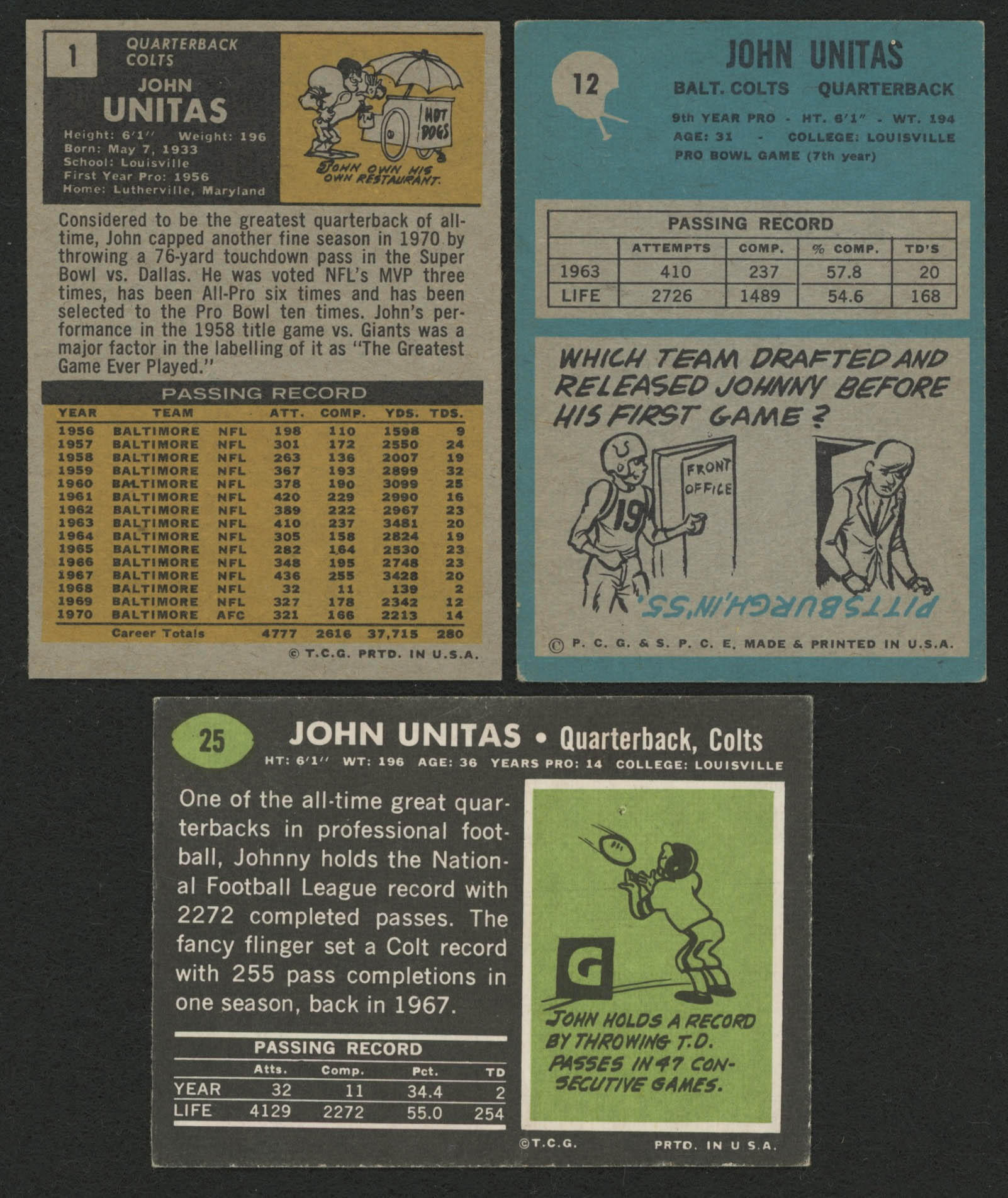 Lot of (3) Johnny Unitas Football Cards with 1964 Philadelphia #12, 1971 Topps #1 Johnny Unitas, & 1969 Topps #25 Johnny Unitas