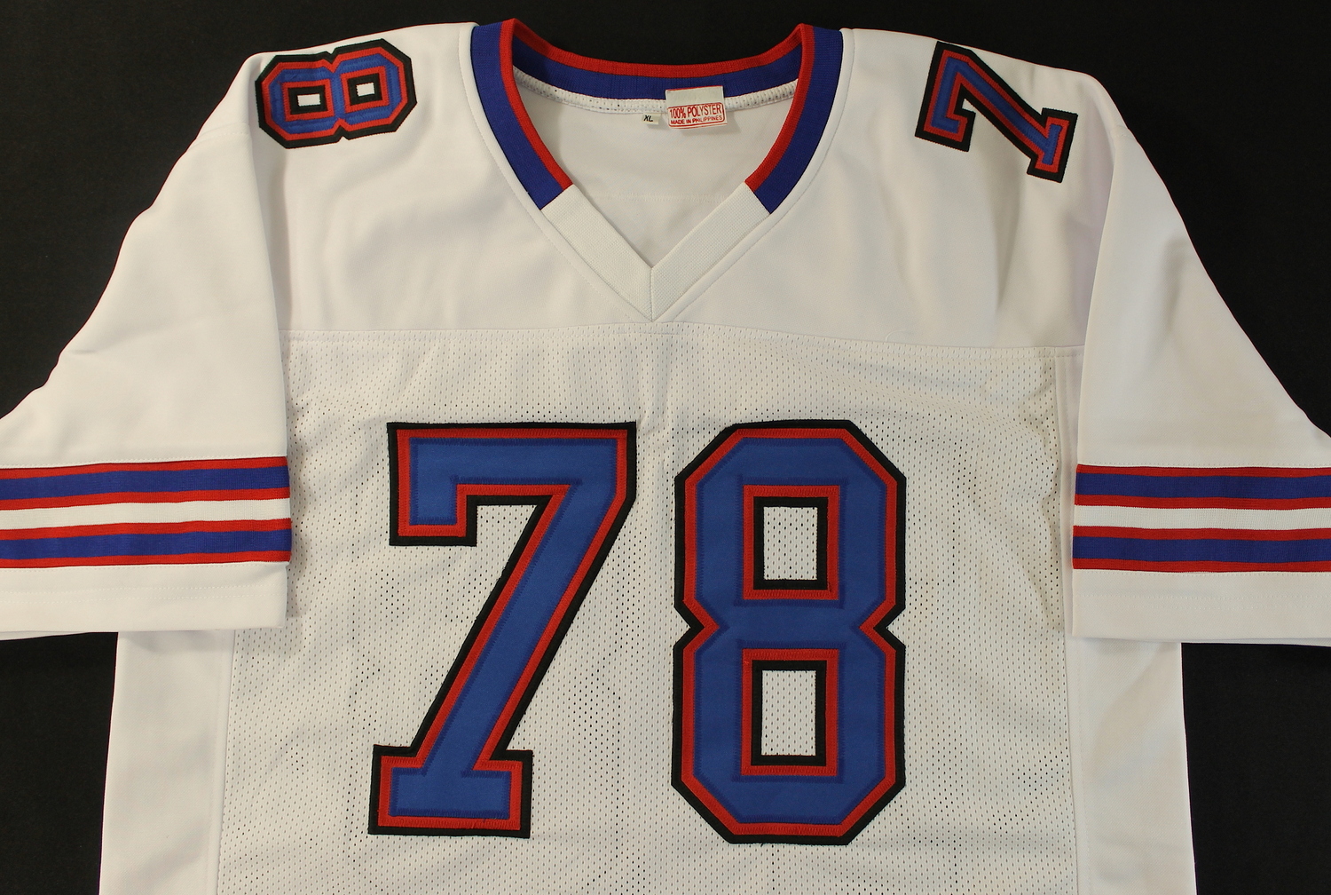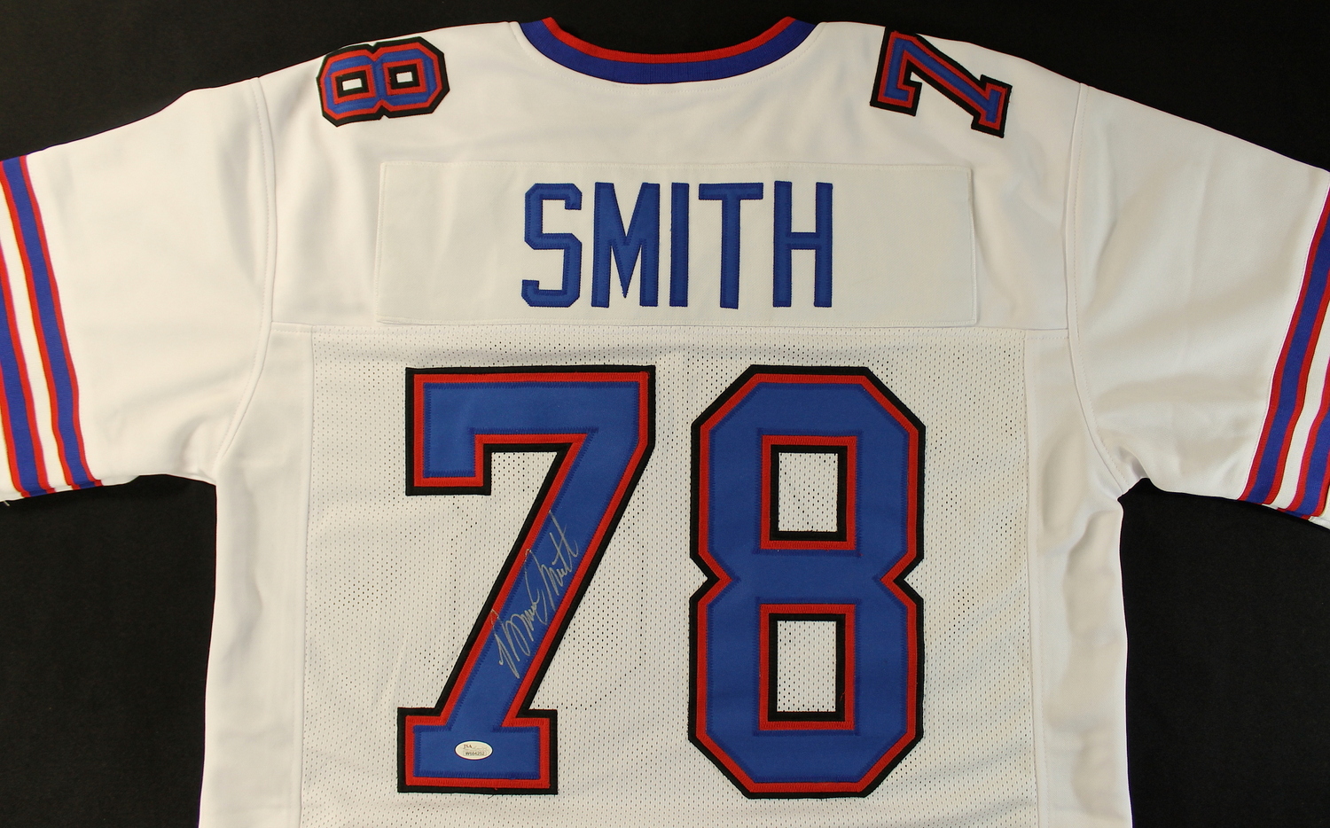 Custom on-field style jersey. Everything is sewn on, size XL. Hand-signed in silver paint pen by Bruce Smith (Bills HOF). The autograph includes an official James Spence Authentication (JSA) hologram and matching COA for authenticity purposes. The signing of this item was witnessed by JSA.