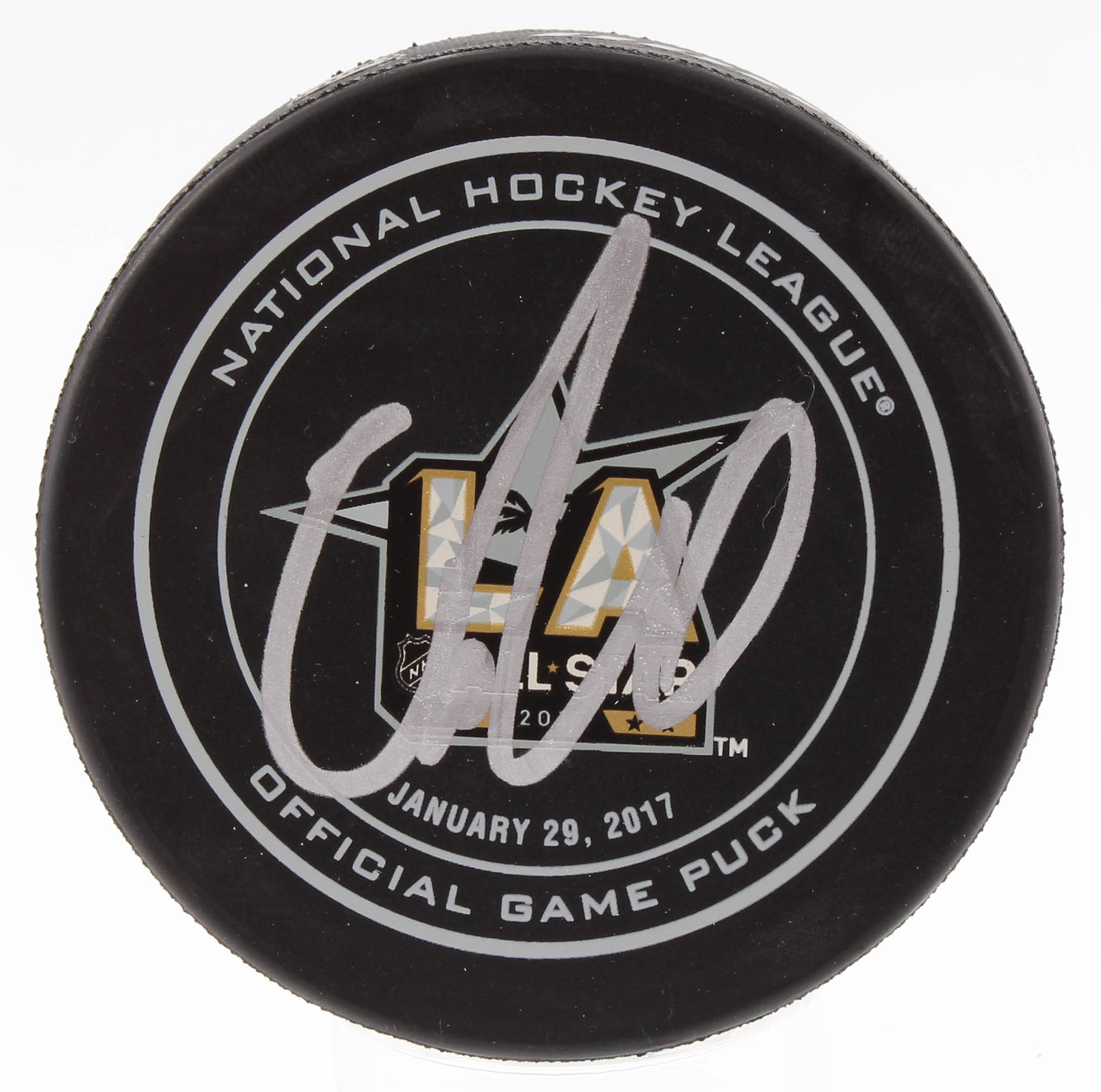 2017 All-Star Game logo hockey puck. Hand-signed in silver paint pen by Connor McDavid (Oilers).