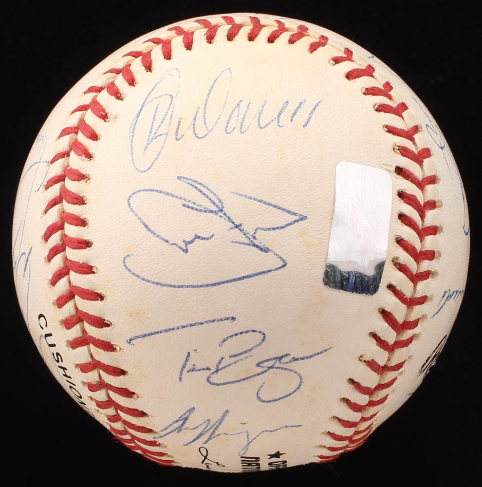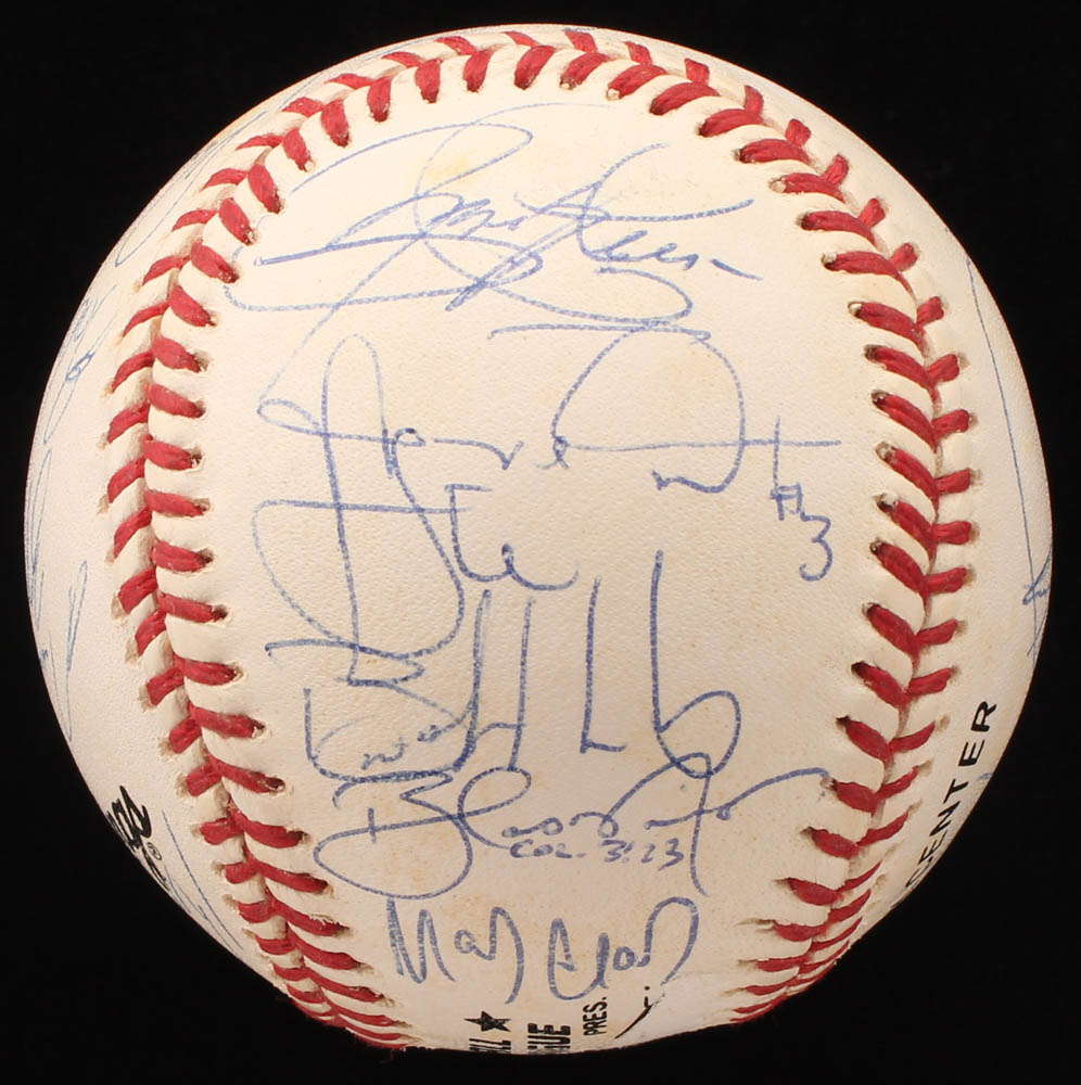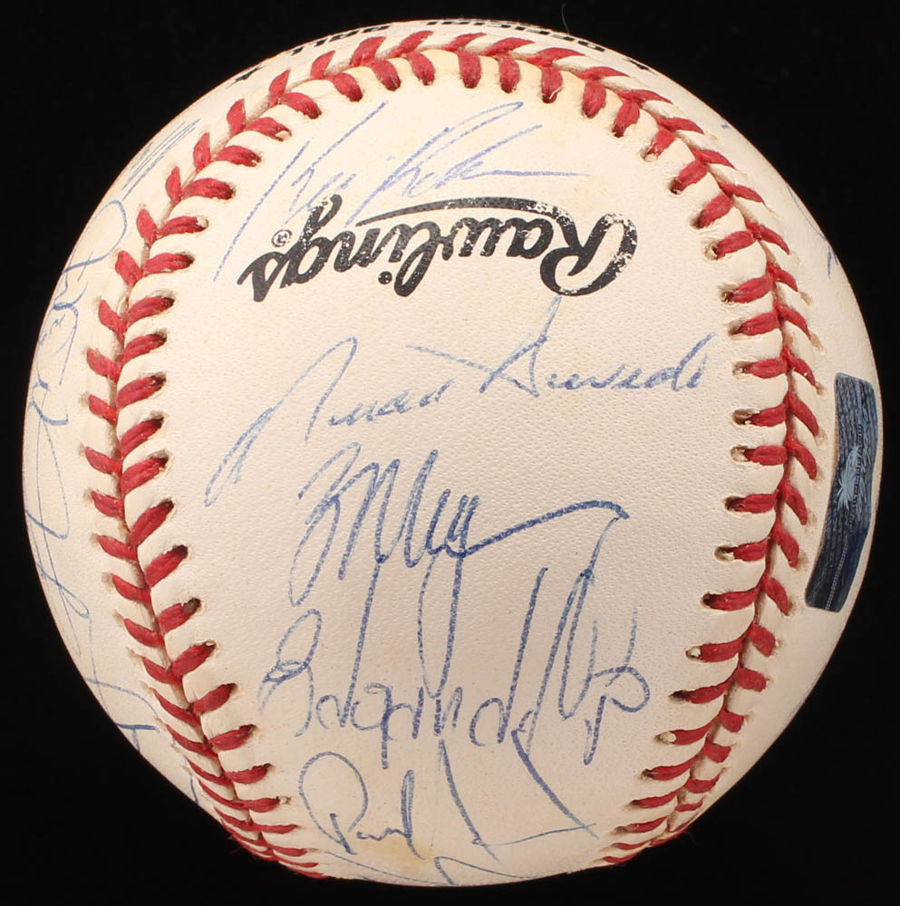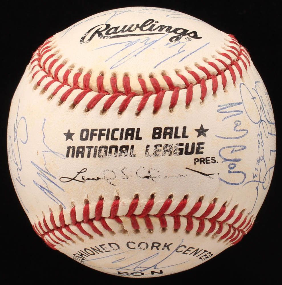 Rawlings Official National League Baseball. Hand-signed in blue ink pen by (17) including Mark Clark, Kevin Roberson, Todd Hundley, Blas Minor, Tim Bogar, Doug Henry, Robert Person, Rico Brogna and (9) more.