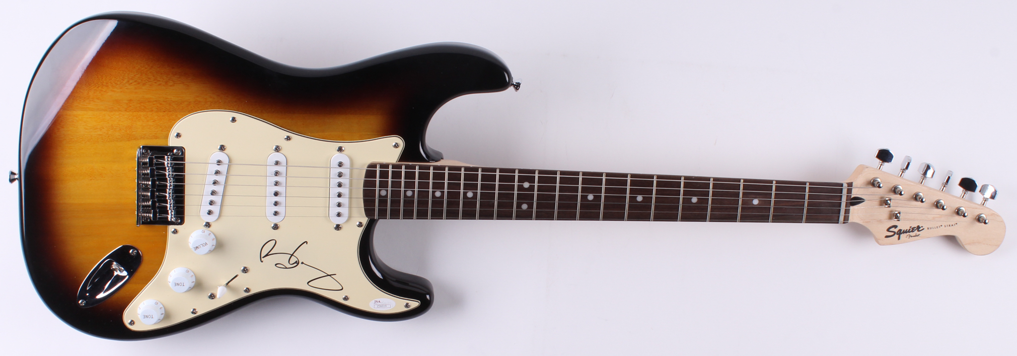 Full-size Fender Squire Bullet Strat electric guitar has been hand-signed on the pickguard in black felt-tip pen by Brian May.