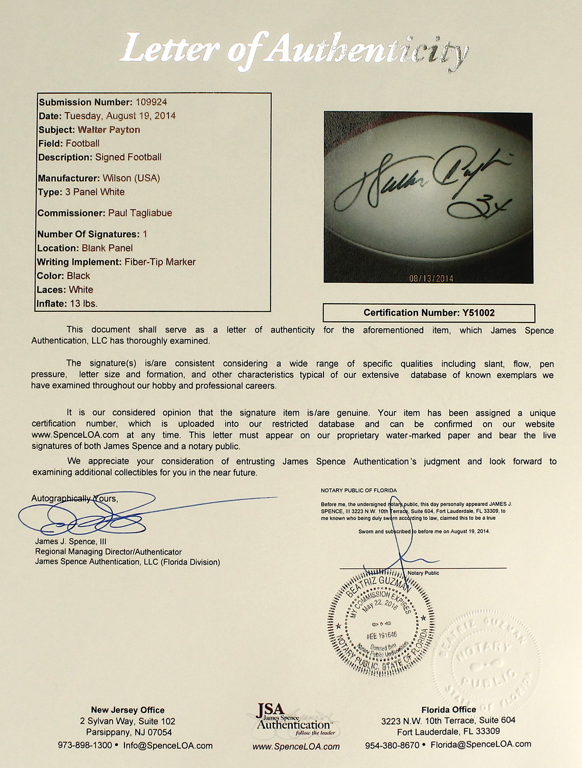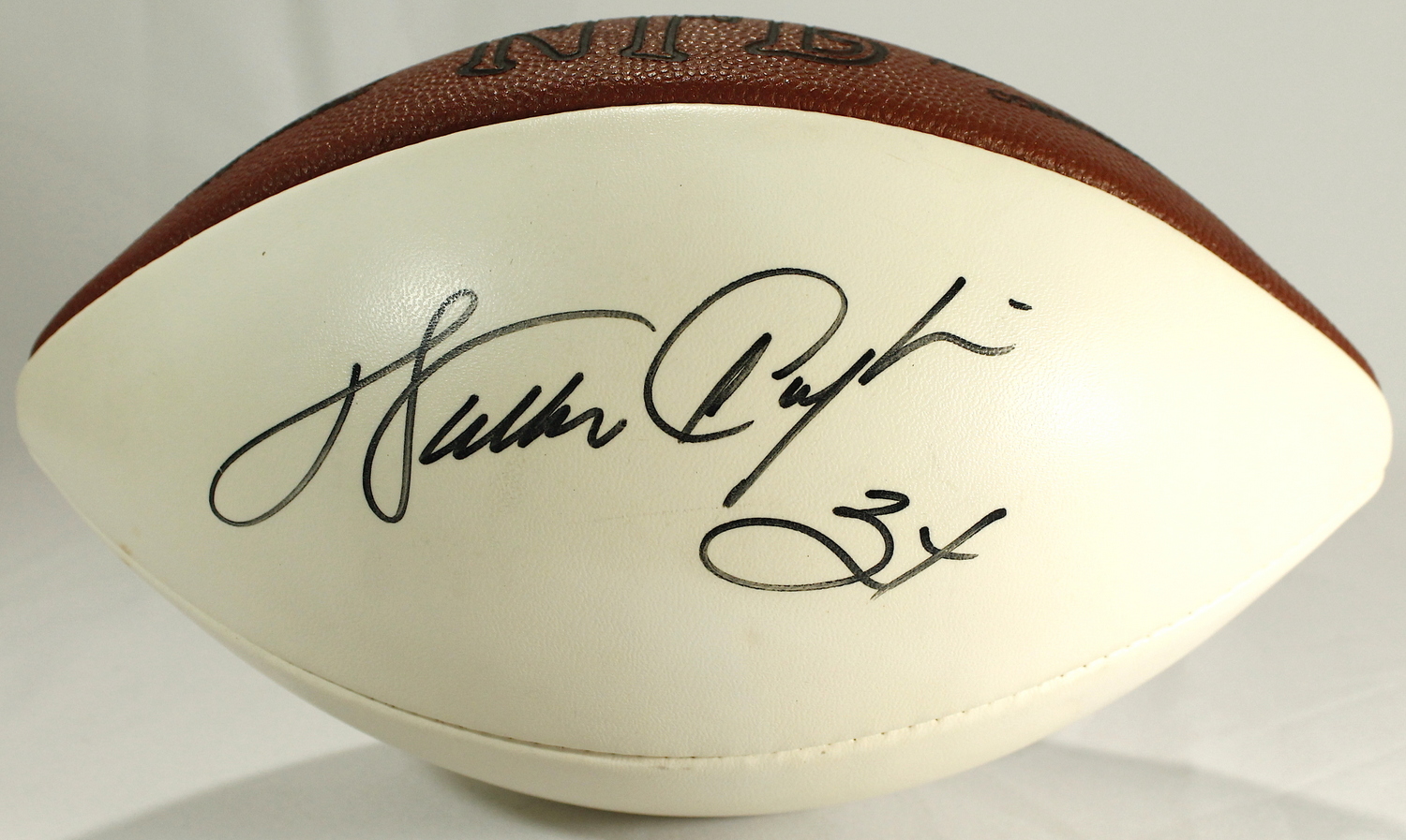 Full-size Wilson white panel football. Hand-signed in black felt-tip pen by Walter Payton (Bears HOF, D 1999). The autograph includes an official James Spence Authentication (JSA) hologram and matching LOA for authenticity purposes.
