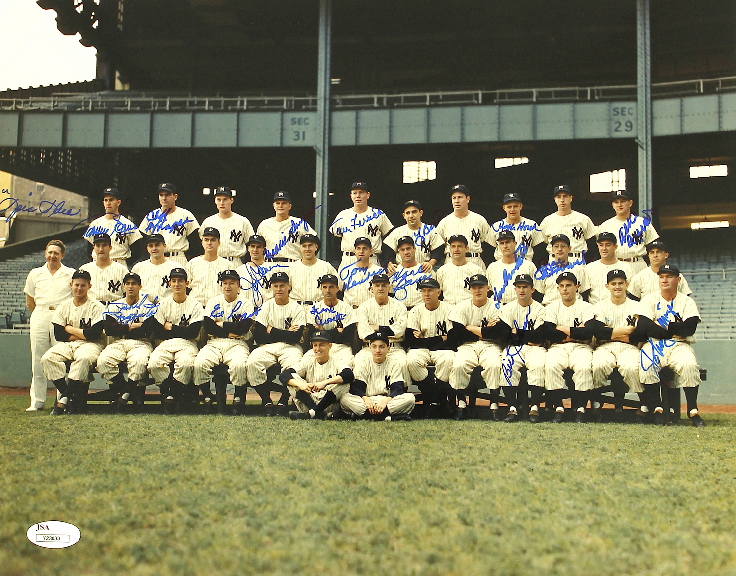 Photo measures 11"x14" in size and has been hand-signed in black felt-tip pen by (18) members of the 1950 World Series Championship team. Autographs include Yogi Berra, Phil Rizzuto, Johnny Mize, Ralph Houk, Lou Burdette, Hank Bauer, Tommy Henrich, Frank Crosetti, Jerry Coleman & others. The autograph includes an official James Spence Authentication (JSA) hologram & an official PSA/DNA hologram for authenticity purposes.