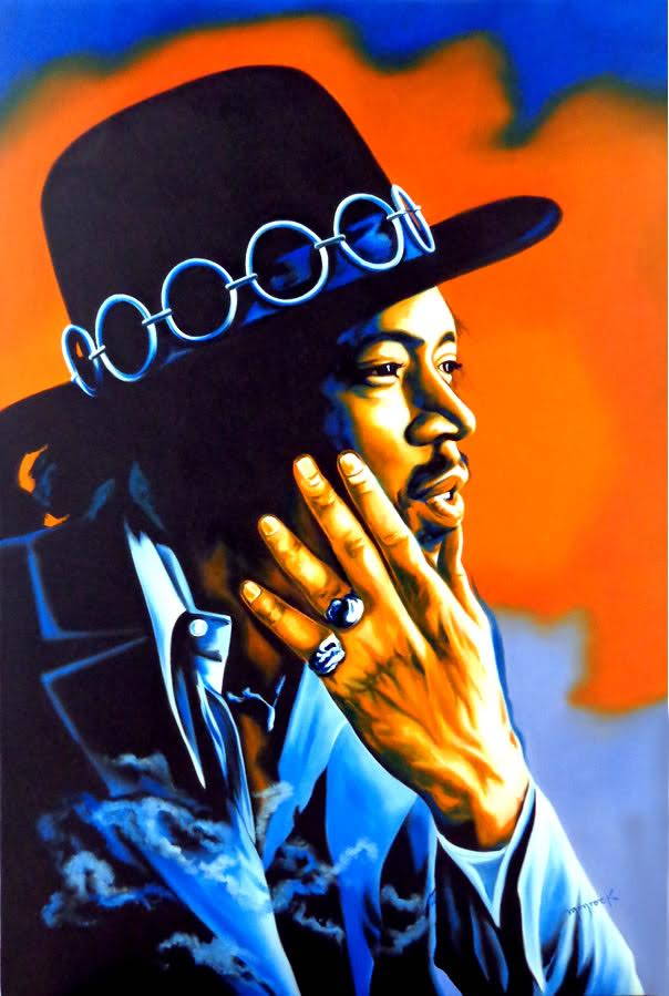 Canvas measures 28.75" x 41.5" in size. "Jimi Hendrix" is an oil painting on canvas that has been hand signed in paint by the artist, Hector Monroy.