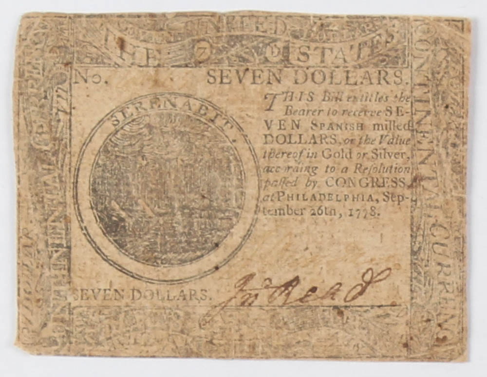 1778 $7 Seven Dollars Continental Colonial Currency Note